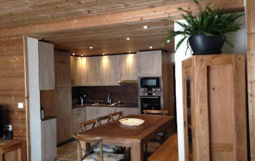 Cuisine américaine toute équipée: table de cuisson à induction, four, micro-ondes, réfrigérateur avec congélateur, lave-vaisselle, grille-pain, cafetière, appareils à raclette, fondues et pierrade.