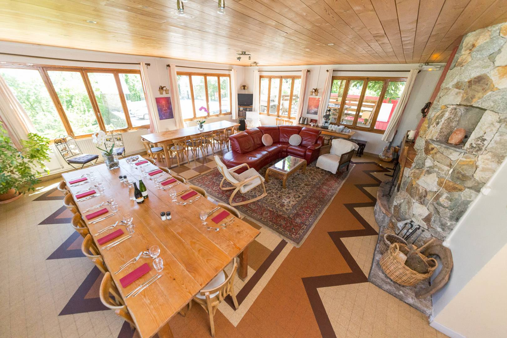 Nous pouvons accueillir des groupes de maximum 23 personnes. Vous avez a disposition 10 chambres, une salle a manger/salon et une cuisine professionnelle. La salle principale est lumineuse et spacieuse, avec des fenêtres sur trois cotés qui ouvrent directement sur les montagnes. La cuisine professionnelle est complètement équipée et il y a de la place ici pour chaque personne de se plaire à l’art de cuisiner. Si vous choisissez de louer avec demi-pension, c’est ici qu’on vous préparera des plats surprenants, variés, bien équilibrés et toujours délicieux.