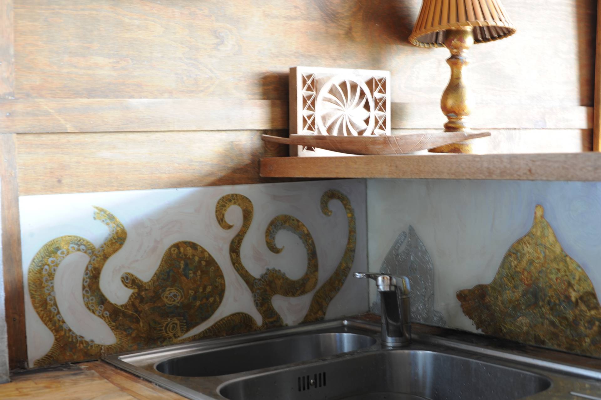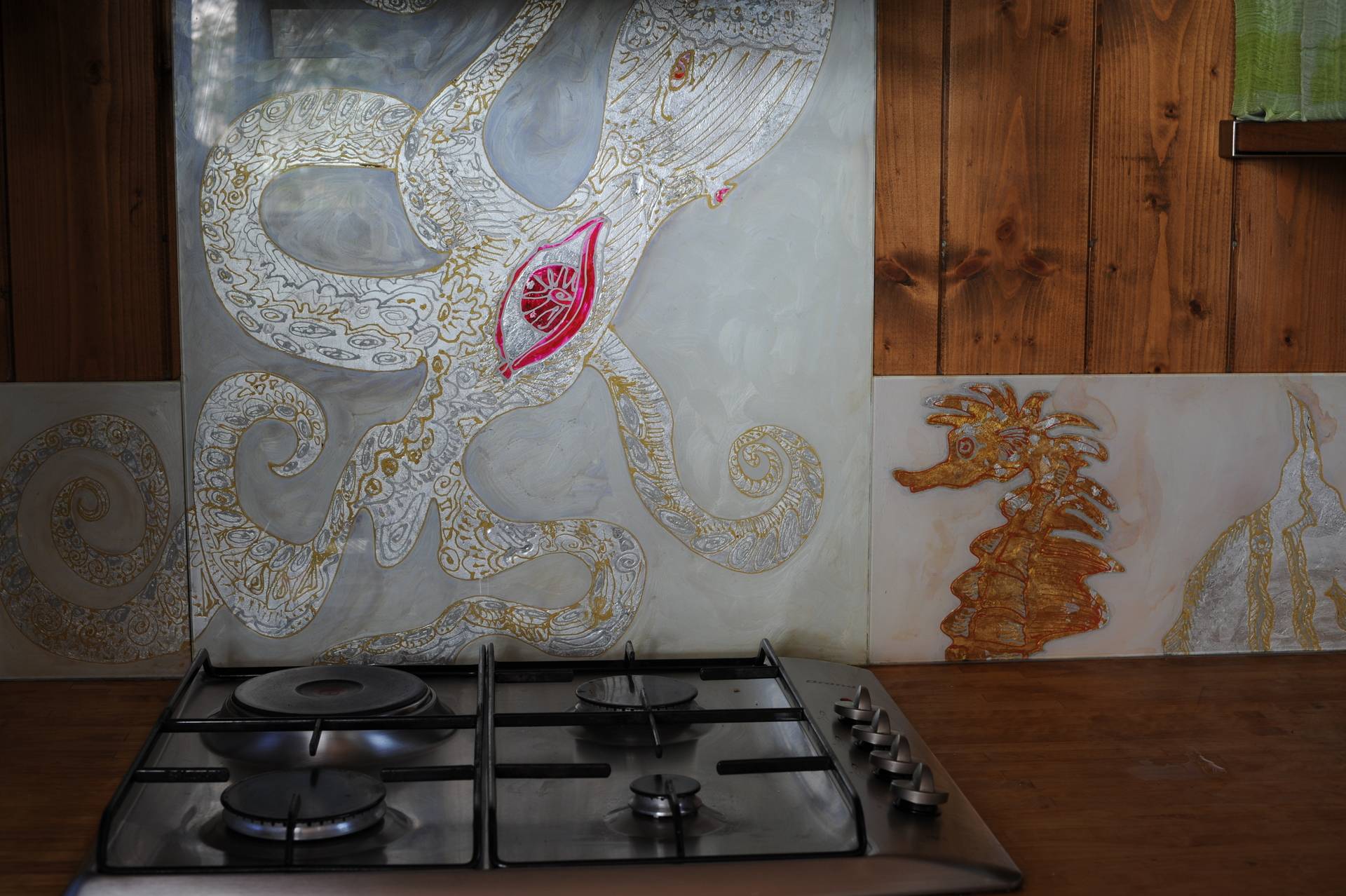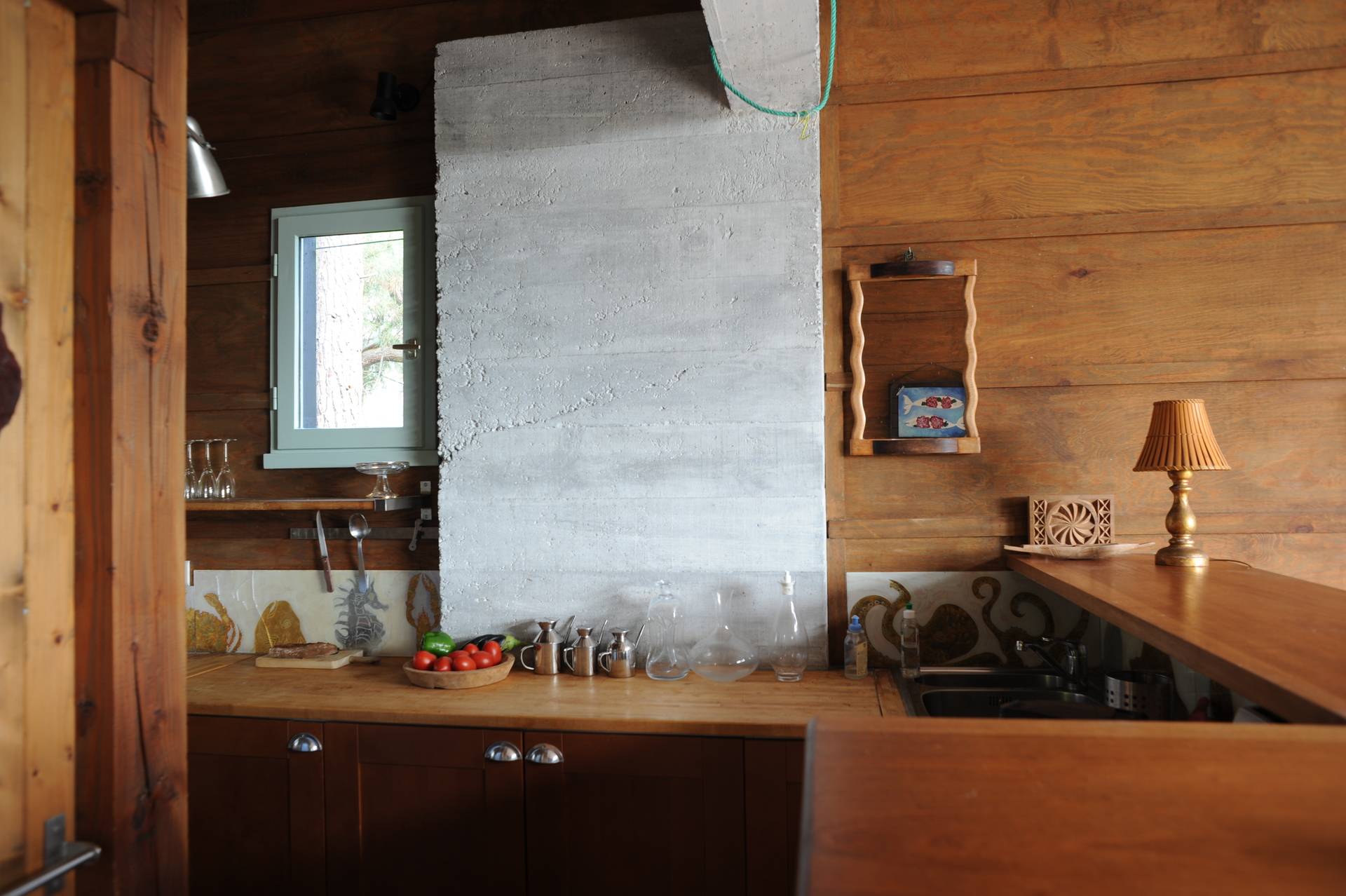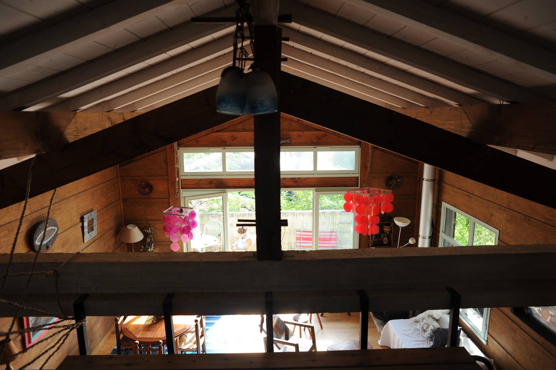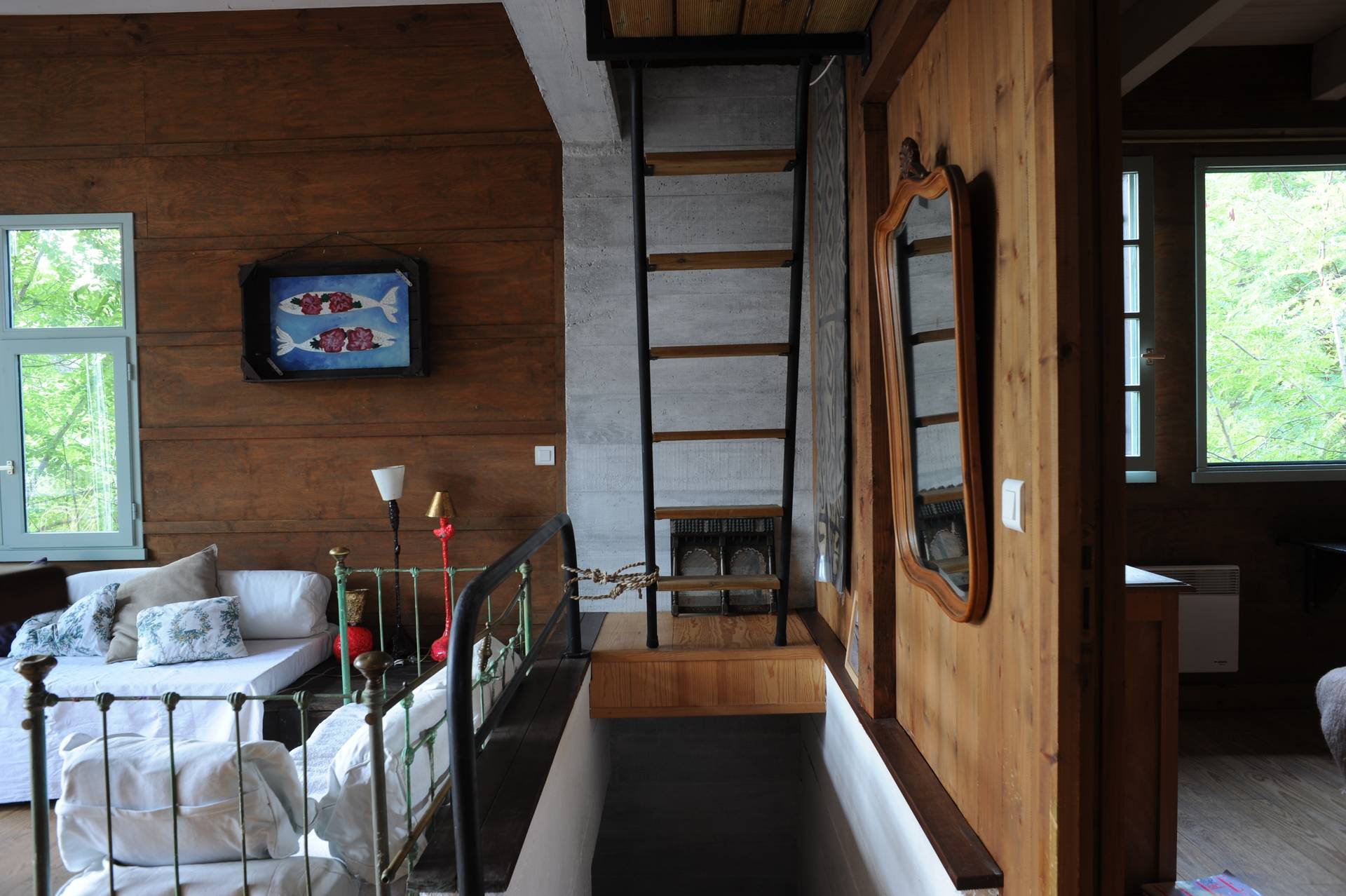 Pour descendre au rez de chaussé trois possibilités une par l'intérieure avec un escalier en bois , deux par l'extérieur ; un escalier extérieur en bois et une rampe de 80 cm de large également en bois , qui rendent la maison fonctionnelle et ludique .