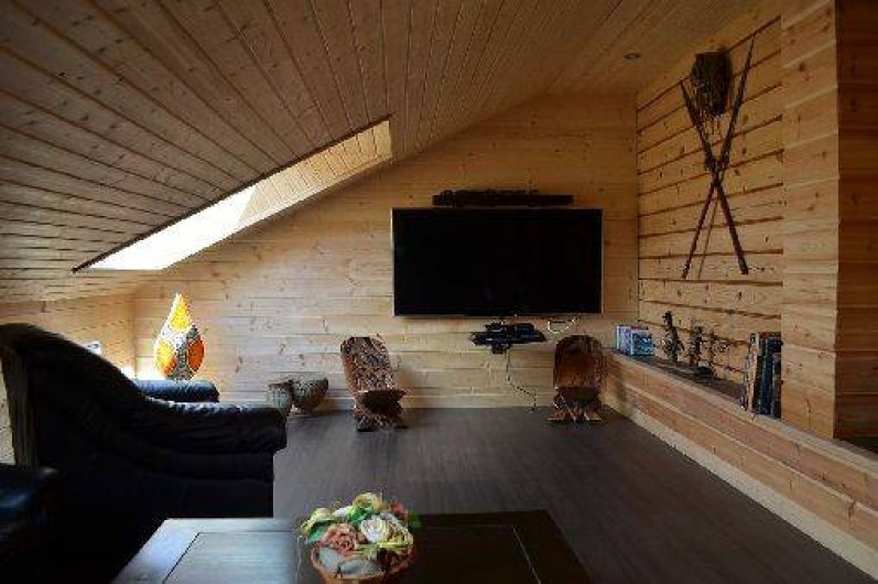 Chalet interieur tout en bois ,situé au coeur meme du massif des hautes vosges à 650 mètres d'altitude, dans un cadre de verdure a 300metres des commerces. parking privé pas de voisinage immediat. trés belle vue sur le village et la montagne (sauna ,balnéothérapie,salle de sport avec télévision),salon télé grand écran3D ,coin lecture avec television ( bibliotheque a dispositions,dvd pour enfant). LE PLUS GRAND REPOS AVEC LE PLUS DE CONFORT POSSIBLE