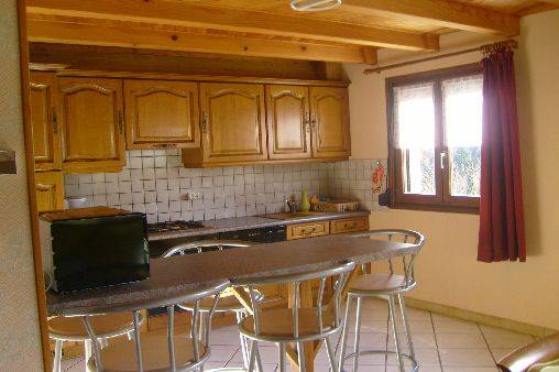 Gîte de plein pied - cuisine intégrée ouverte sur salon et séjour. Cheminée à l'âtre "insert"