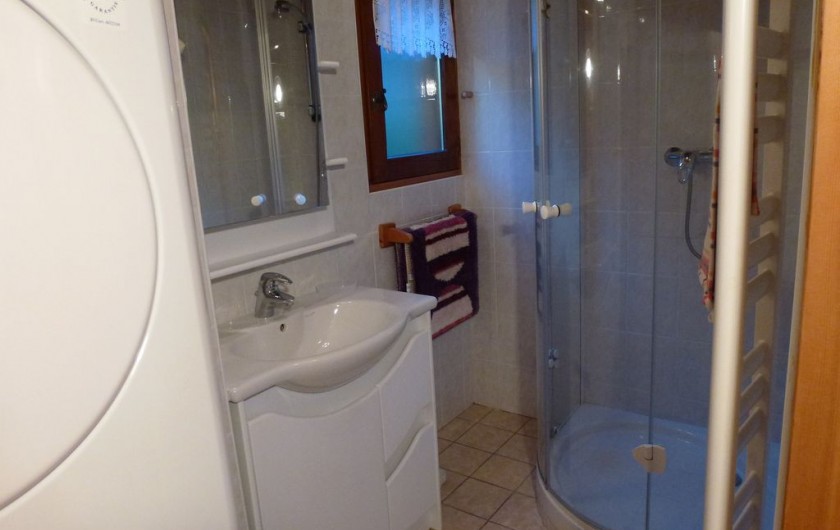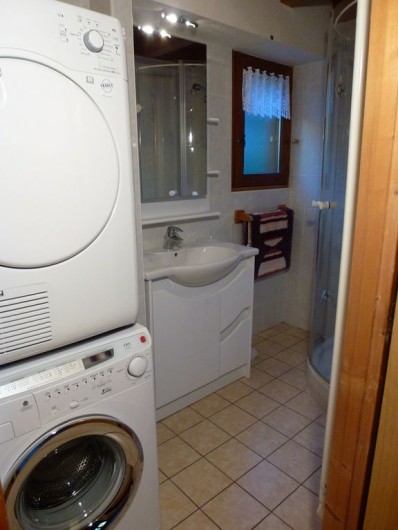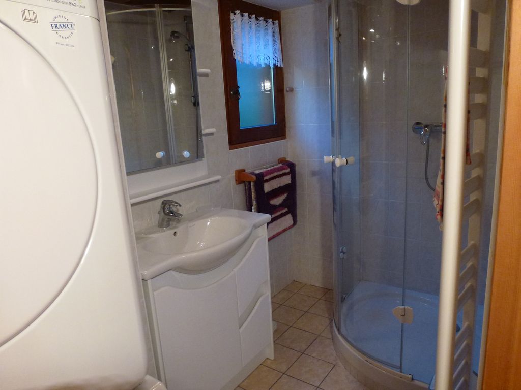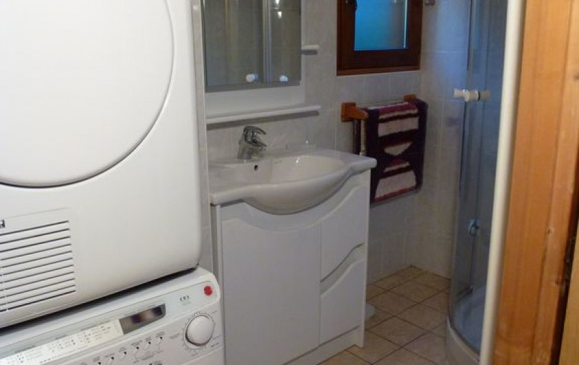 1 Cabine douche 1 Meuble de rangement avec lavabo incorporé plus une glace sur le dessus 1 Sèche et porte serviette électrique 1 Lave linge et un sèche linge superposé 1 Sèche cheveux Babyliss 1 Pèse personne 1 Sèche linge portable blanc