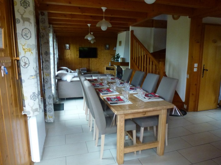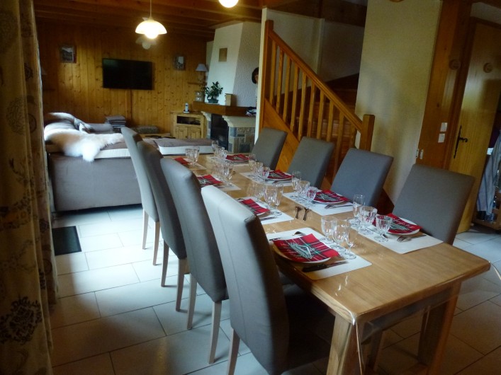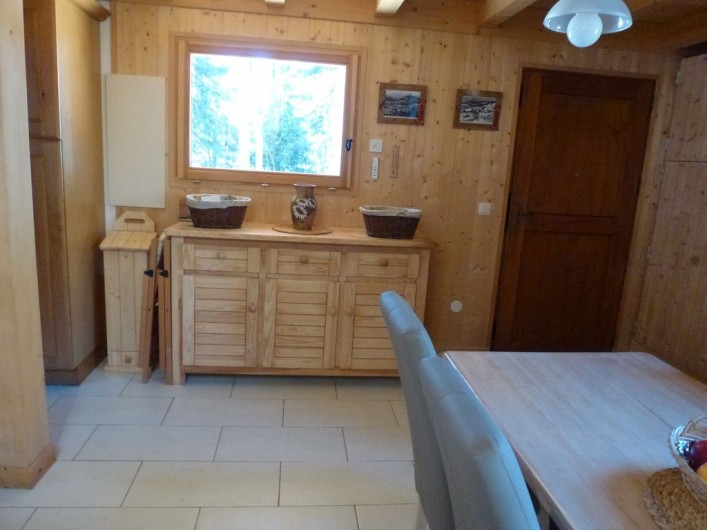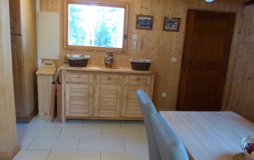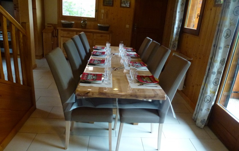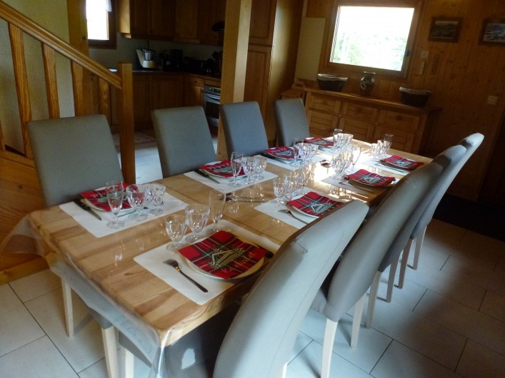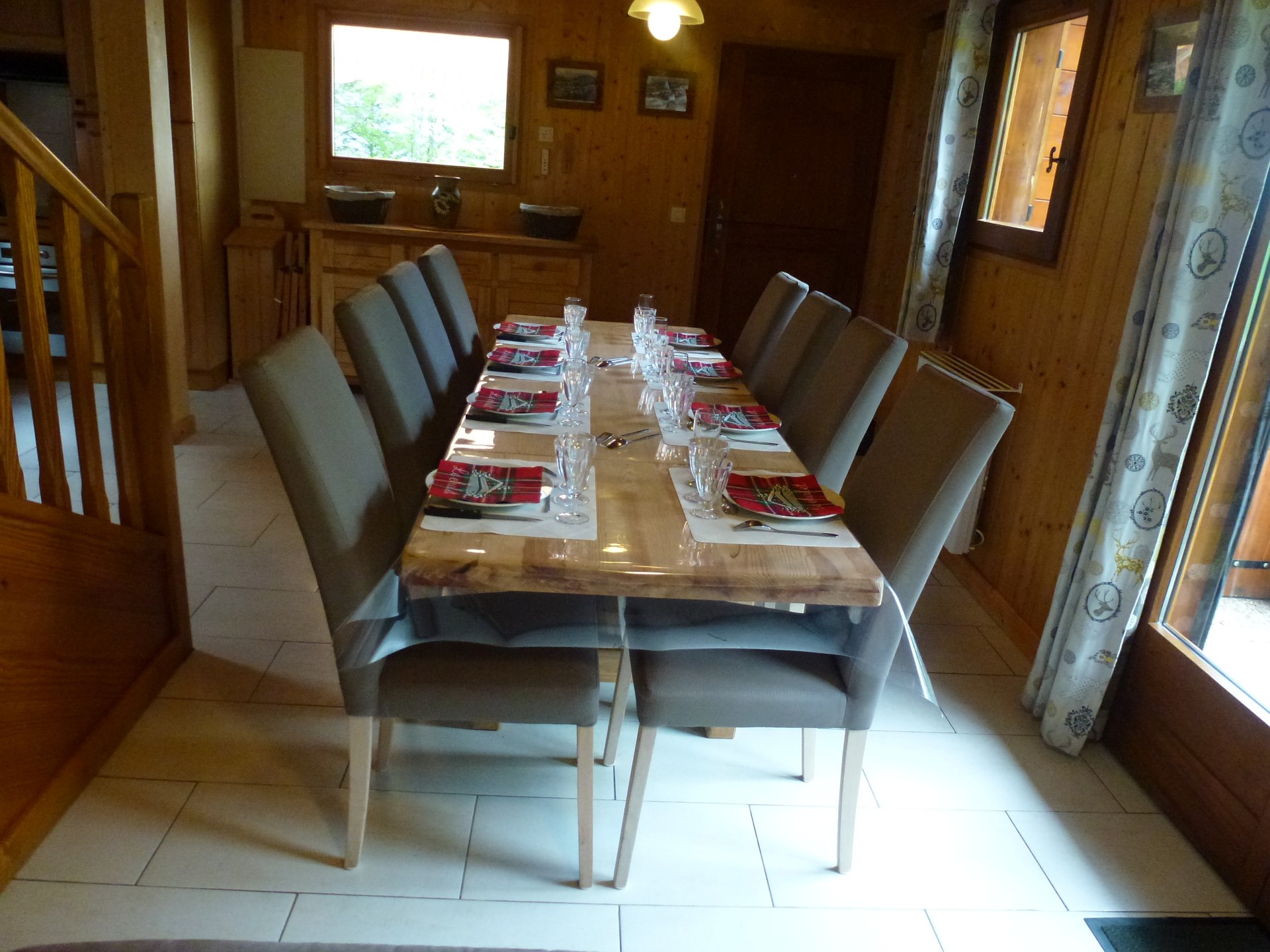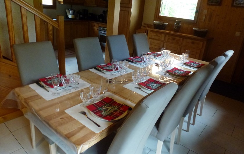 1 Buffet bas 3 portes 3 tiroirs 1 Table en pin longueur 2.40 m avec nappe bulgomme 8 Chaises en pin avec housses 2 Chaises pliantes avec housses