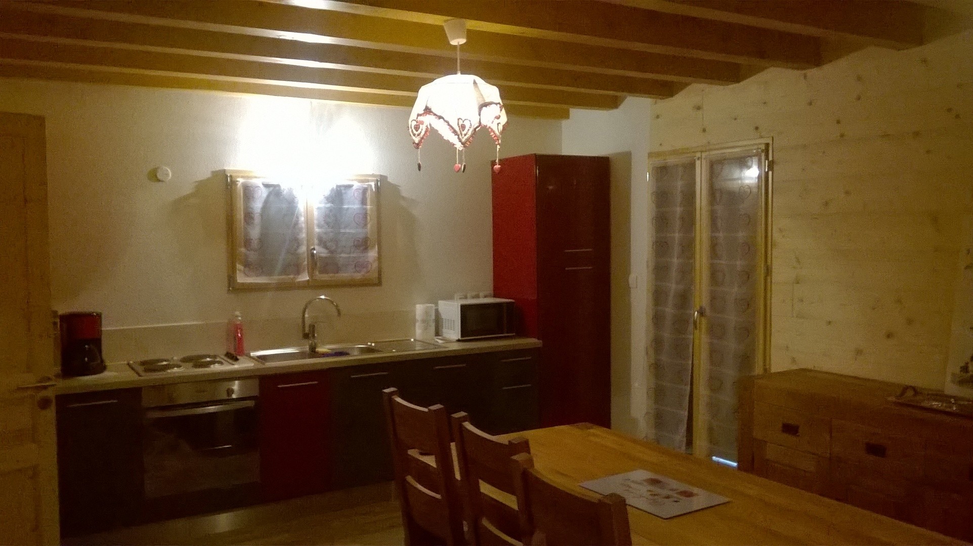 Le chalet dispose d'une cuisine équipée (frigo, lave-vaisselle, four, micro-onde, plaque induction, lave-linge et autres petits electroménagers ).