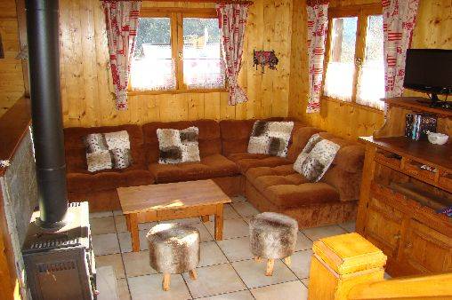 Chalet de 6 personnes en ossature bois avec cheminée (bois fournis) et une grande terrasse avec salon de jardin et barbecue.