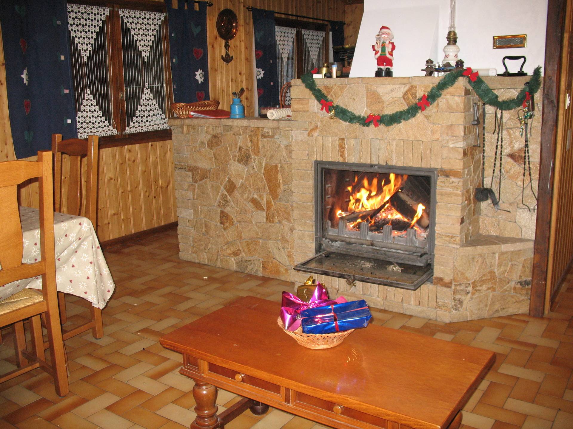 APRES QUELQUES MARCHES NOUS ARRIVONS AU PREMIER ETAGE OU SE TROUVE L APPARTEMENT. VOUS ETES DANS LA SALLE A MANGER TRES SPACIEUSE UNE GRANDE TABLE POUR 8 PERSONNES, UN CLIC CLAC, UNE TABLE BASSE, UN BAHUT ET UNE DECORATION DE NOEL VOUS ATTENDENT. NOUS CONTINUONS LA VISITE