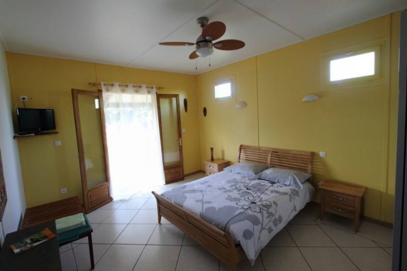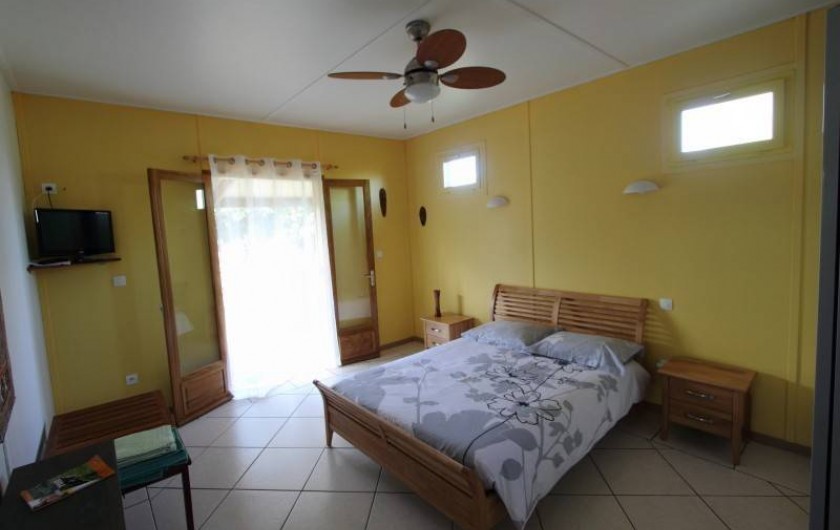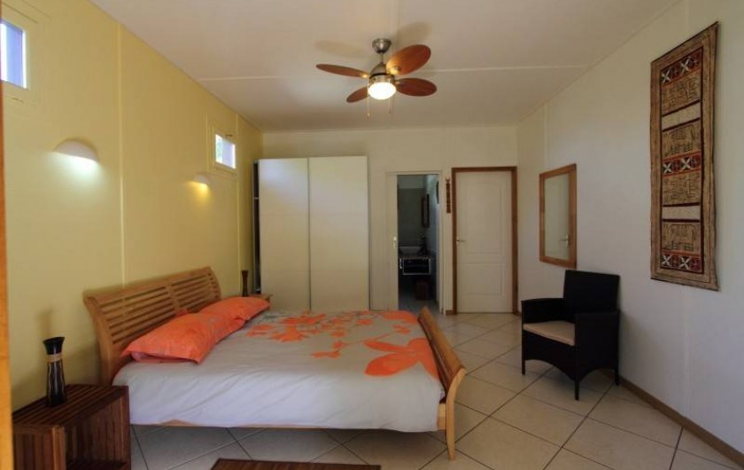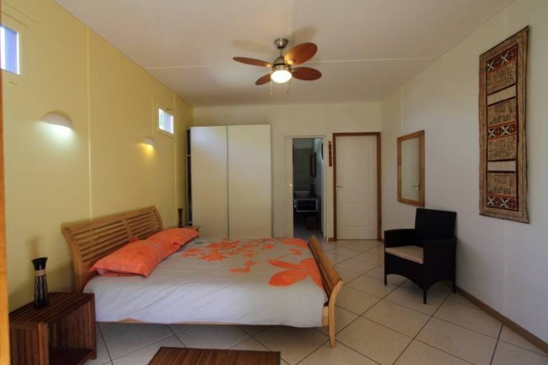 Une grande chambre de 24 m² avec un lit 2 places , grande moustiquaire , ventilateur plafonnier et grande armoire de rangement.