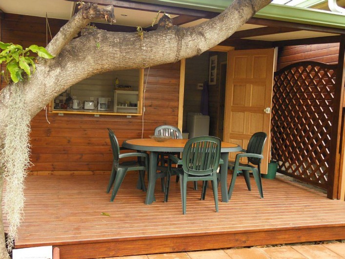La terrasse pour les repas est pourvue d'une grande table et de 4 chaises .