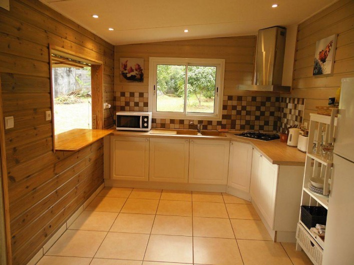 La cuisine est entièrement équipée : plaque de cuisson au gaz + hotte, réfrigérateur , lave-linge, four micro-ondes , four électrique , fer à repasser , petit électro-ménager ( cafetière , grille-pain , bouilloire..) vaisselle et ustensiles de cuisine.