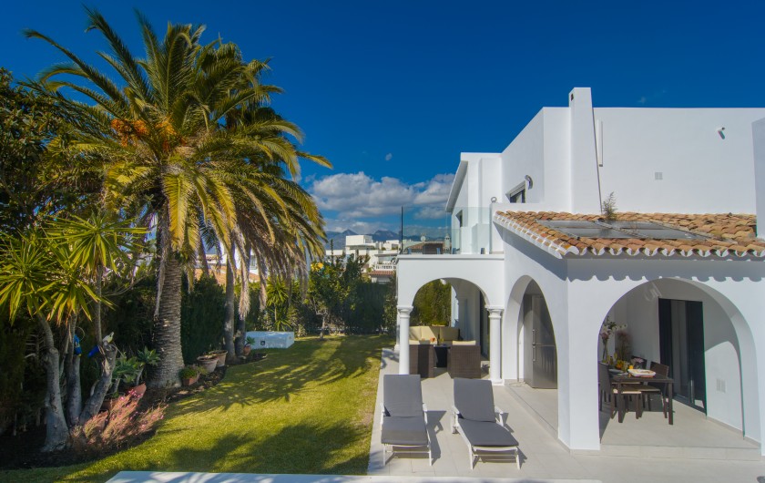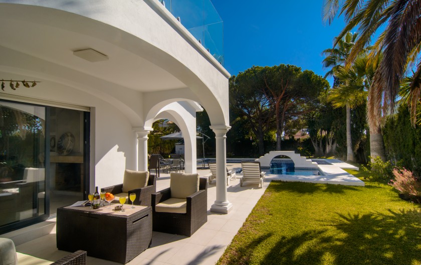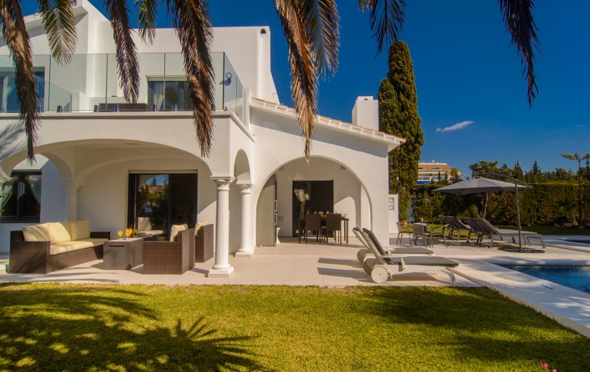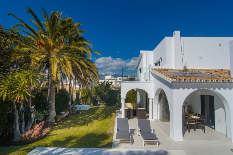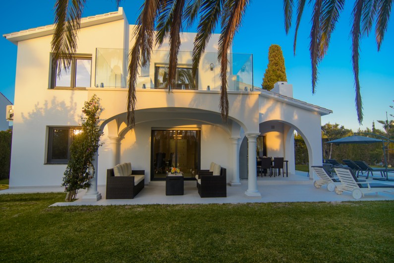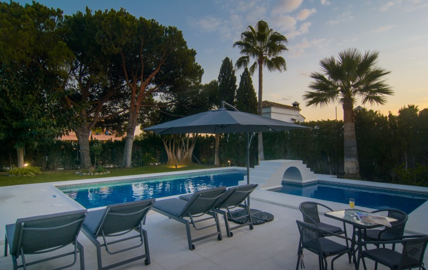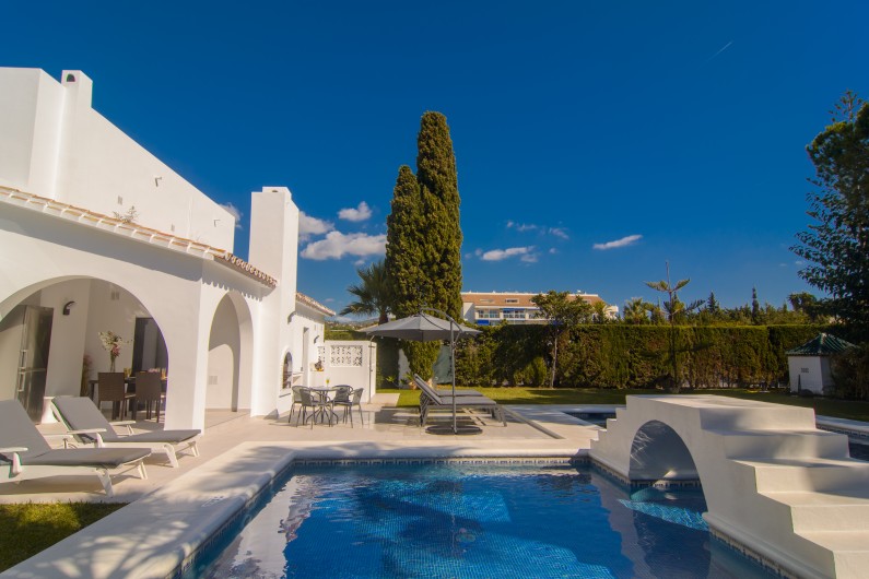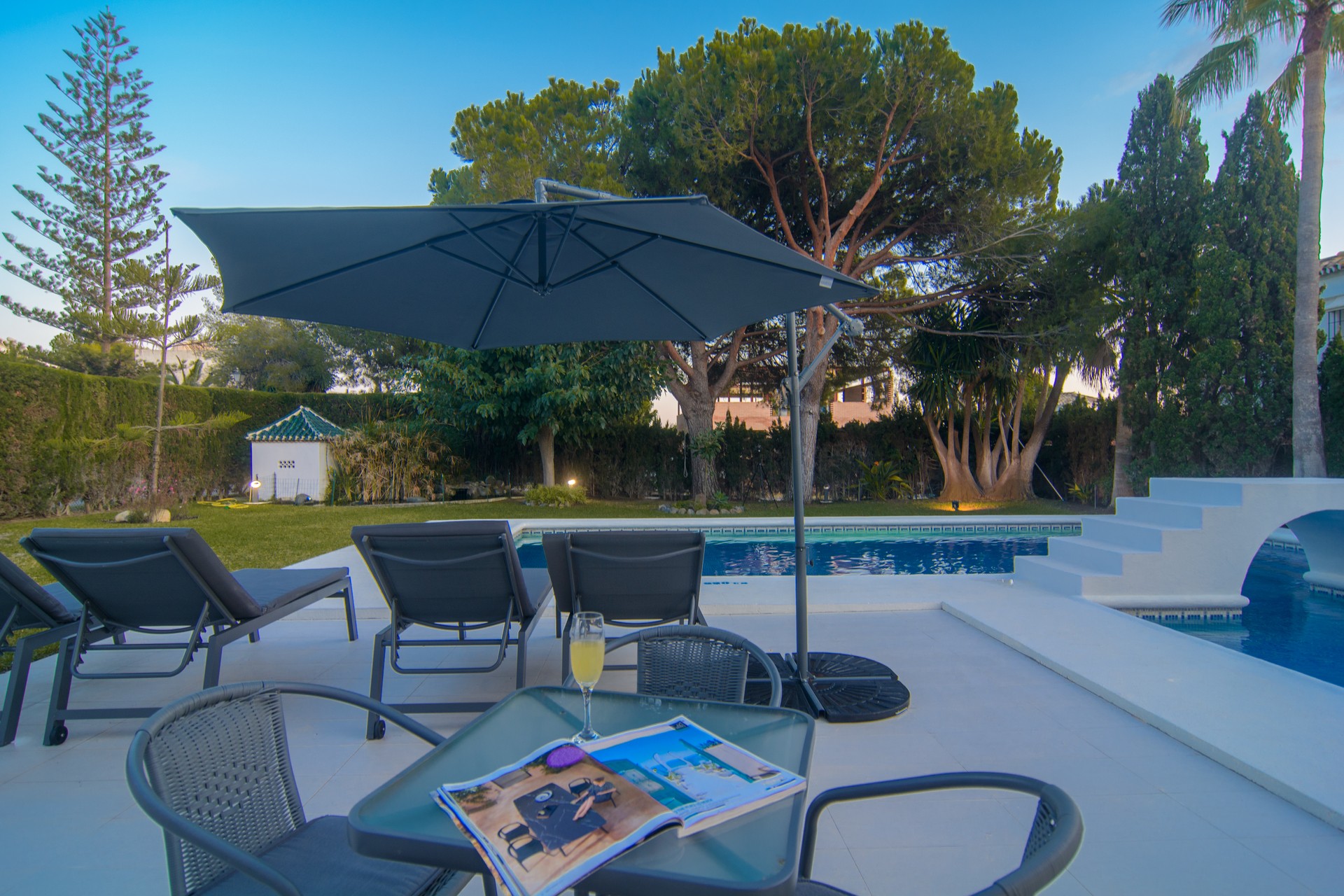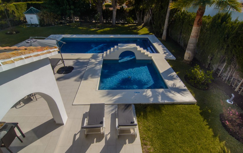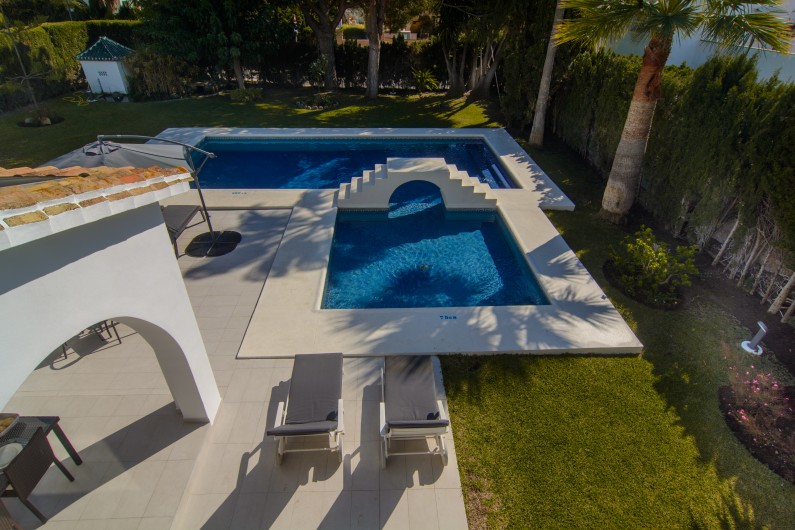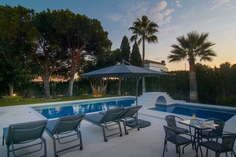 La belle terrasse spacieuse avec accès depuis le salon est meublée d'une table à manger en rotin pour six personnes ayant accès à un réfrigérateur spacieux. De là, vous pouvez admirer la belle végétation méditerranéenne du grand jardin (1000m2) et de la piscine. Le jardin manucuré qui entoure la piscine possède de beaux palmiers et une clôture verte offre une intimité à cet espace. Une petite table à manger pour quatre personnes est placée près de la piscine, avec un parapluie pour les chaudes journées d'été. L'espace barbecue vous permet de préparer des repas spéciaux pendant les soirées fraîches. Si vous n'avez pas envie de marcher jusqu'au bord de la mer, vous pouvez vous détendre au bord de la piscine sur l'une des six chaises longues placées ici pour votre plus grand confort. La piscine en forme de L a deux zones distinctes : la partie principale fait 9mx4m, la piscine pour enfants fait 3m x 3m, un pont de piscine qui sépare les zones et des escaliers romains.