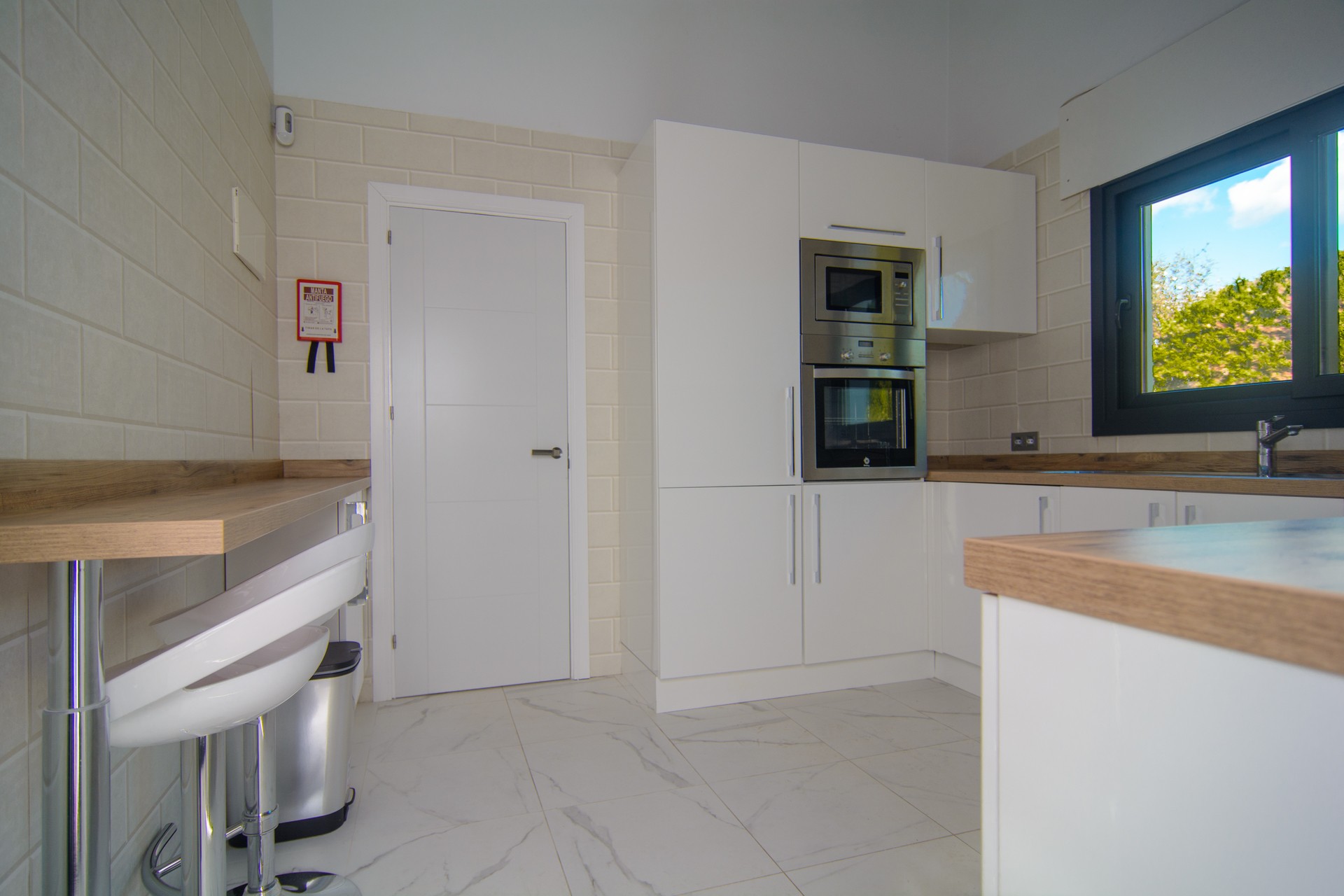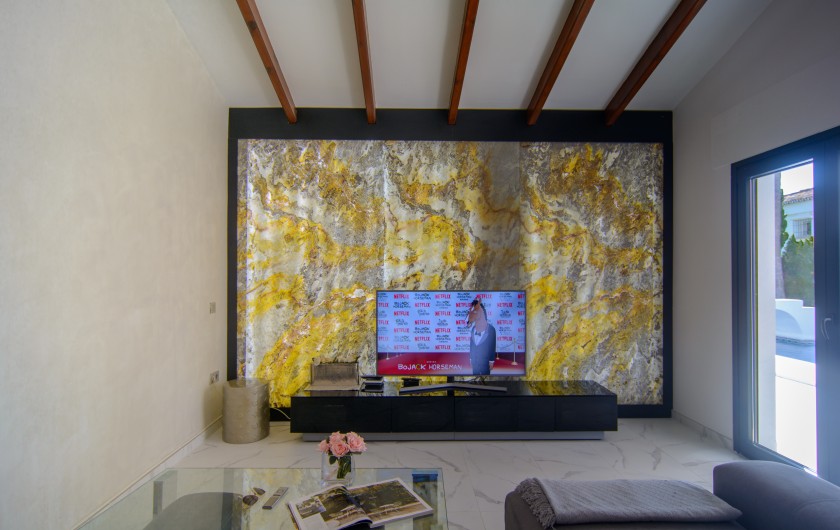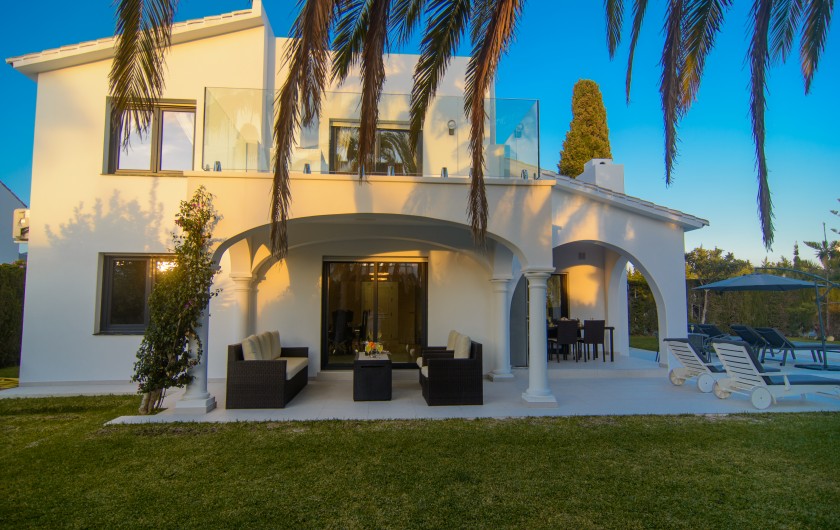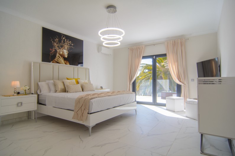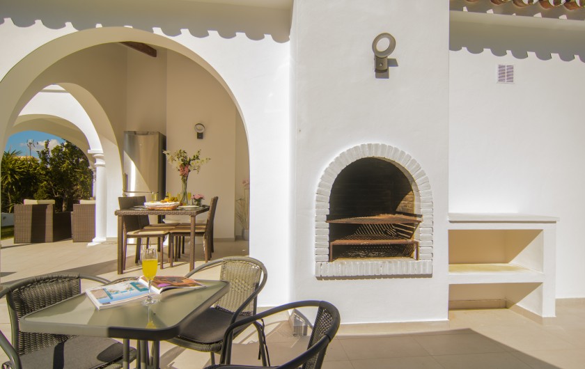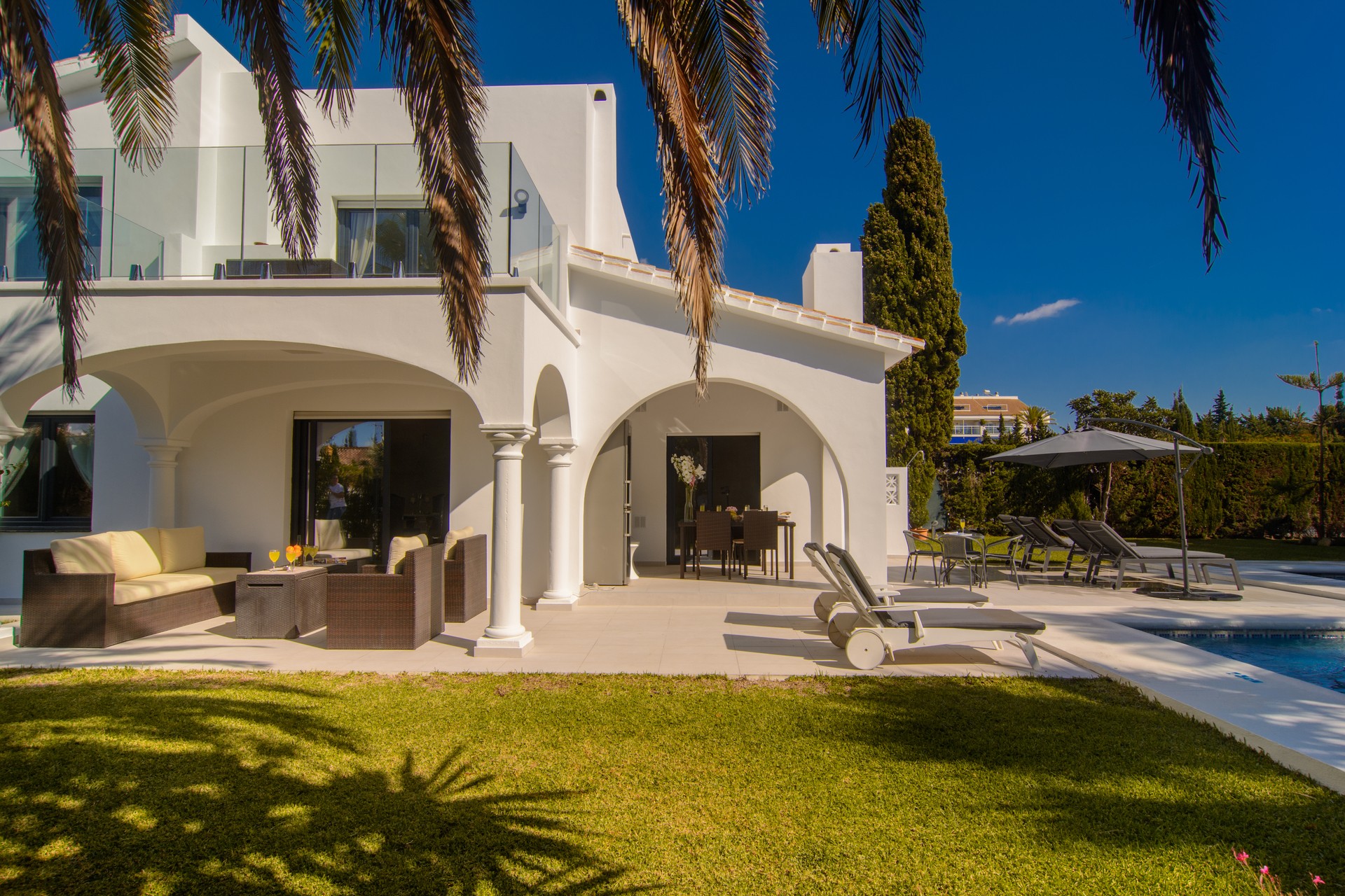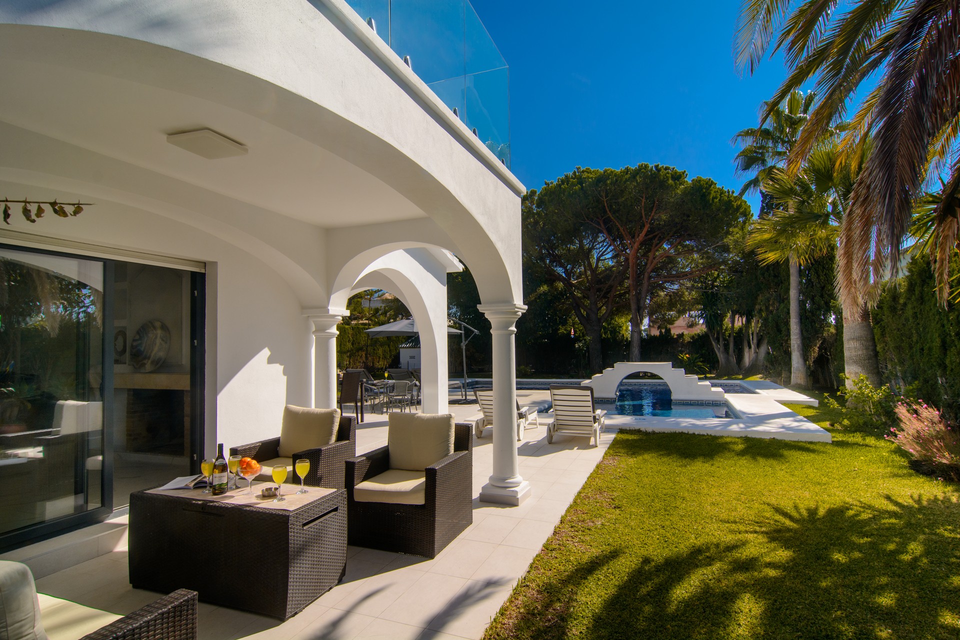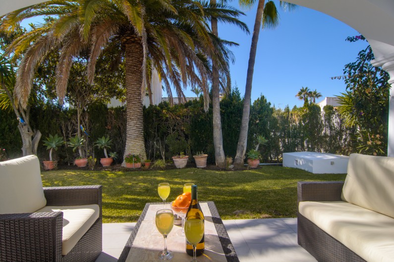 La belle terrasse spacieuse avec accès depuis le salon est meublée d'une table à manger en rotin pour six personnes ayant accès à un réfrigérateur spacieux. De là, vous pouvez admirer la belle végétation méditerranéenne du grand jardin (1000m2) et de la piscine. Le jardin manucuré qui entoure la piscine possède de beaux palmiers et une clôture verte offre une intimité à cet espace. Une petite table à manger pour quatre personnes est placée près de la piscine, avec un parapluie pour les chaudes journées d'été. L'espace barbecue vous permet de préparer des repas spéciaux pendant les soirées fraîches. Si vous n'avez pas envie de marcher jusqu'au bord de la mer, vous pouvez vous détendre au bord de la piscine sur l'une des six chaises longues placées ici pour votre plus grand confort. La piscine en forme de L a deux zones distinctes : la partie principale fait 9mx4m, la piscine pour enfants fait 3m x 3m, un pont de piscine qui sépare les zones et des escaliers romains.