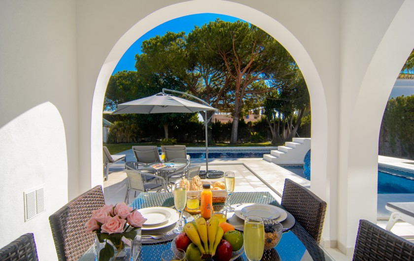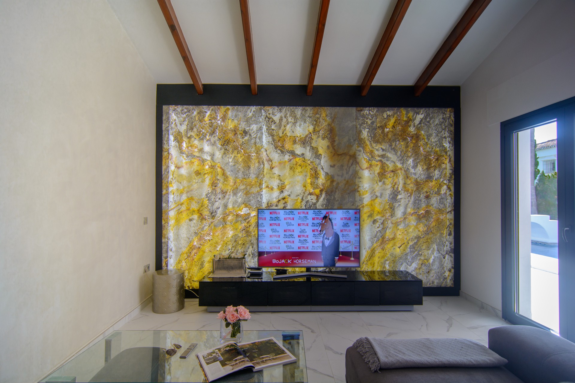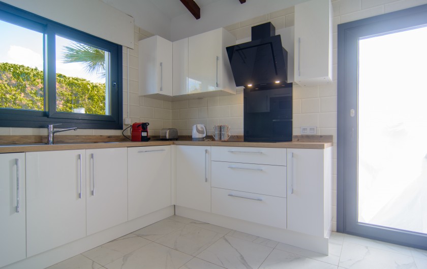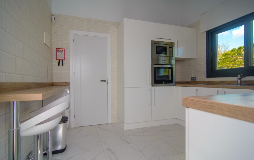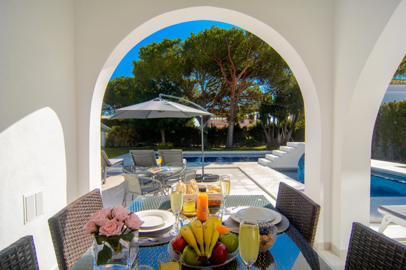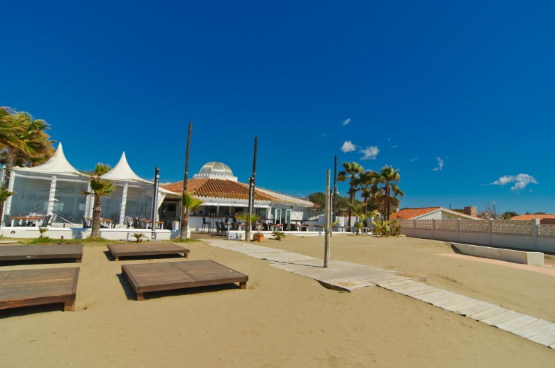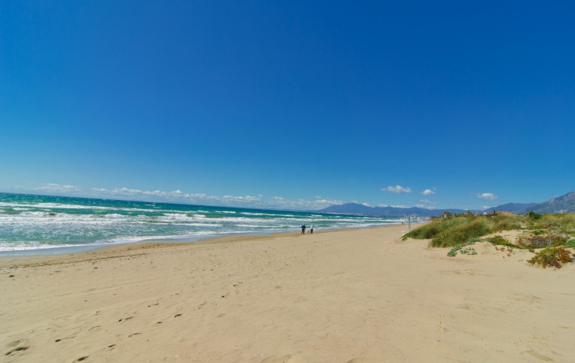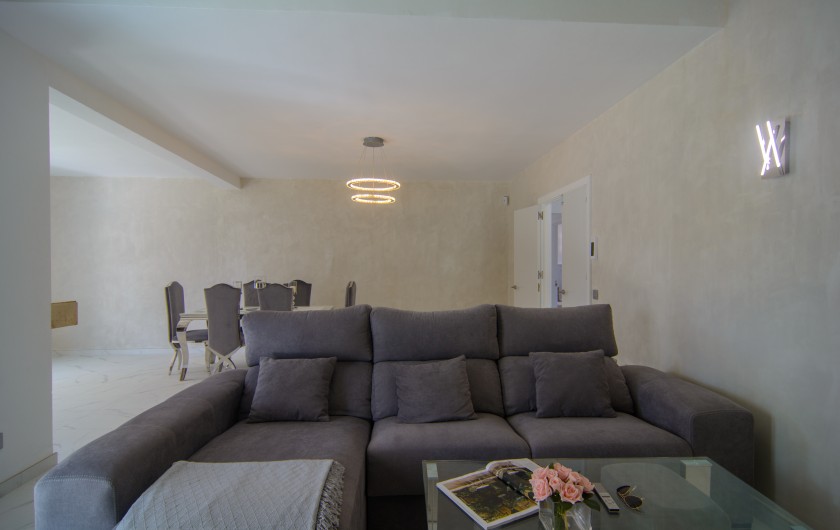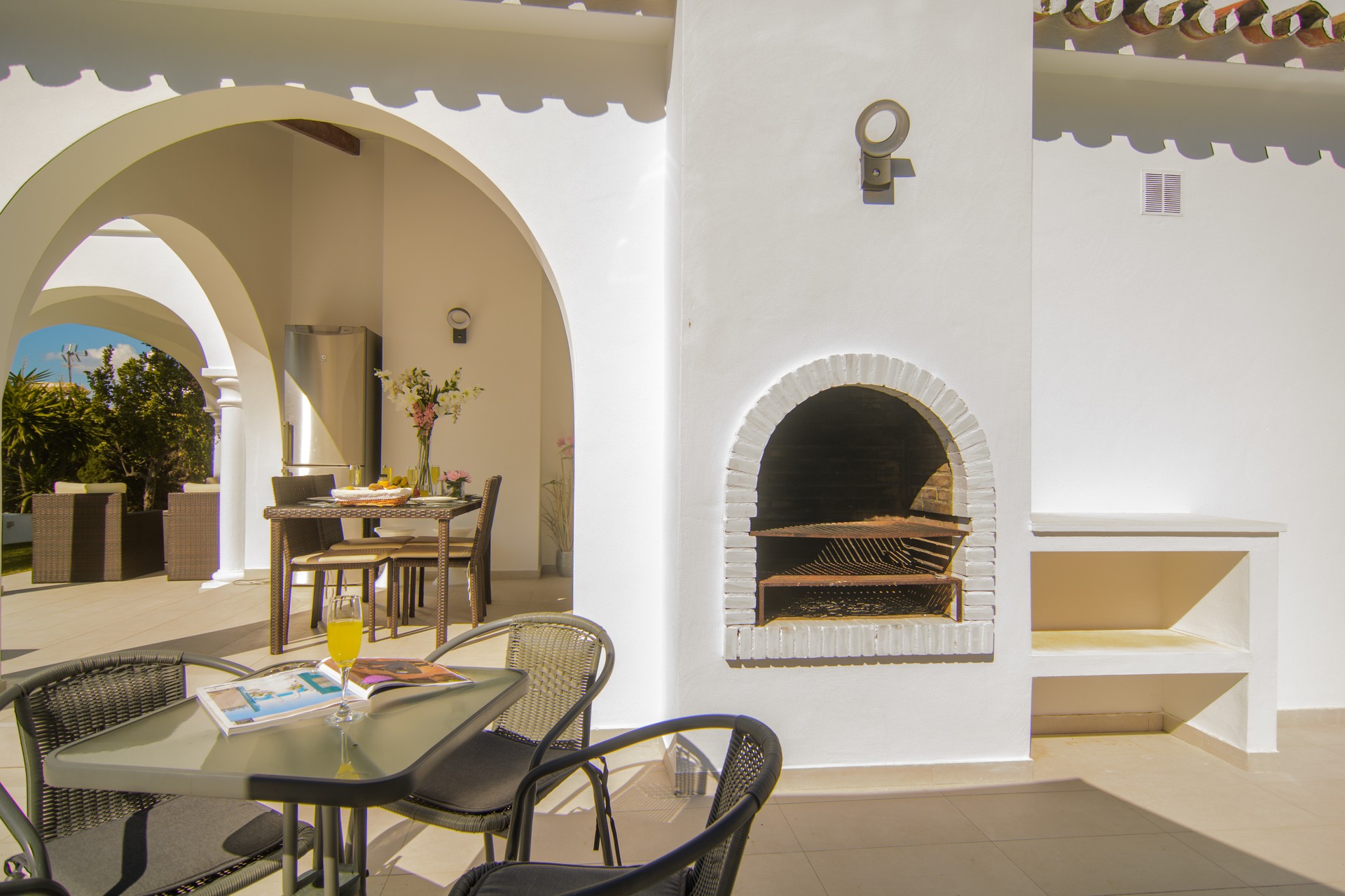 La belle terrasse spacieuse avec accès depuis le salon est meublée d'une table à manger en rotin pour six personnes ayant accès à un réfrigérateur spacieux. De là, vous pouvez admirer la belle végétation méditerranéenne du grand jardin (1000m2) et de la piscine. Le jardin manucuré qui entoure la piscine possède de beaux palmiers et une clôture verte offre une intimité à cet espace. Une petite table à manger pour quatre personnes est placée près de la piscine, avec un parapluie pour les chaudes journées d'été. L'espace barbecue vous permet de préparer des repas spéciaux pendant les soirées fraîches. Si vous n'avez pas envie de marcher jusqu'au bord de la mer, vous pouvez vous détendre au bord de la piscine sur l'une des six chaises longues placées ici pour votre plus grand confort. La piscine en forme de L a deux zones distinctes : la partie principale fait 9mx4m, la piscine pour enfants fait 3m x 3m, un pont de piscine qui sépare les zones et des escaliers romains.