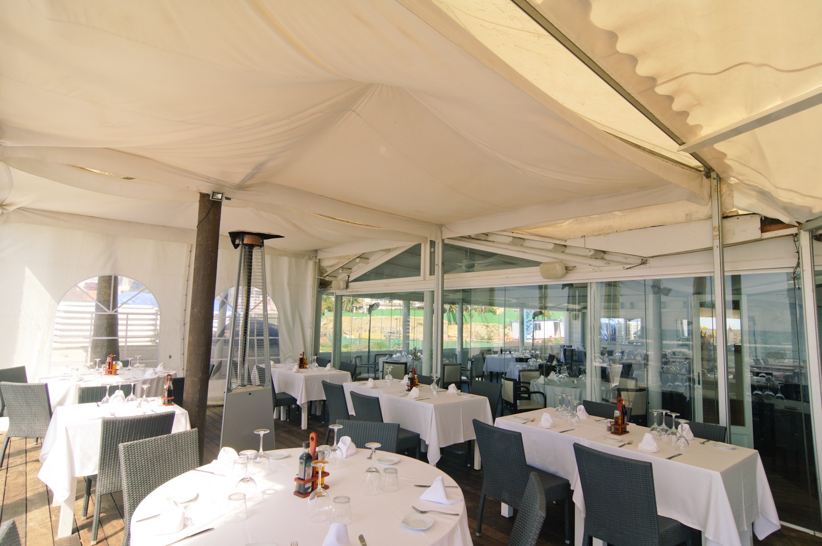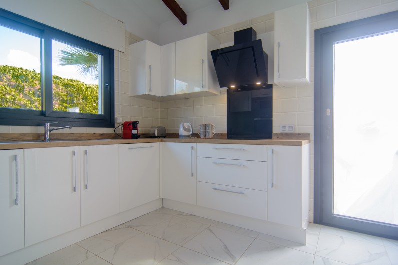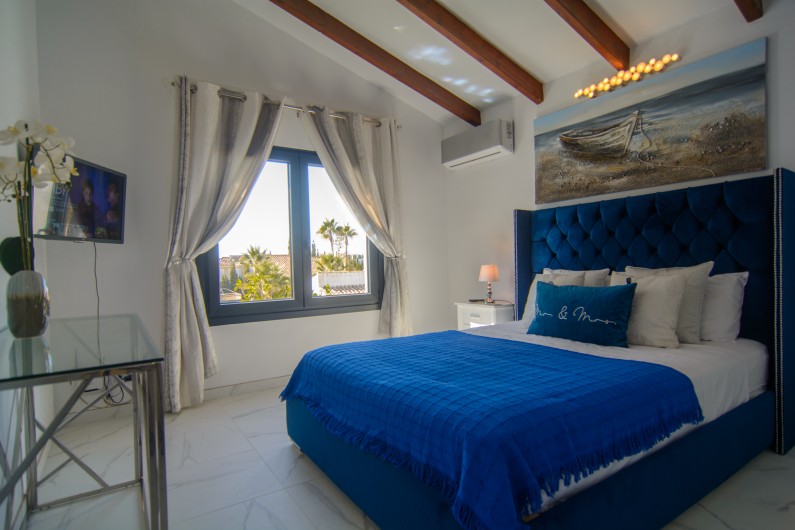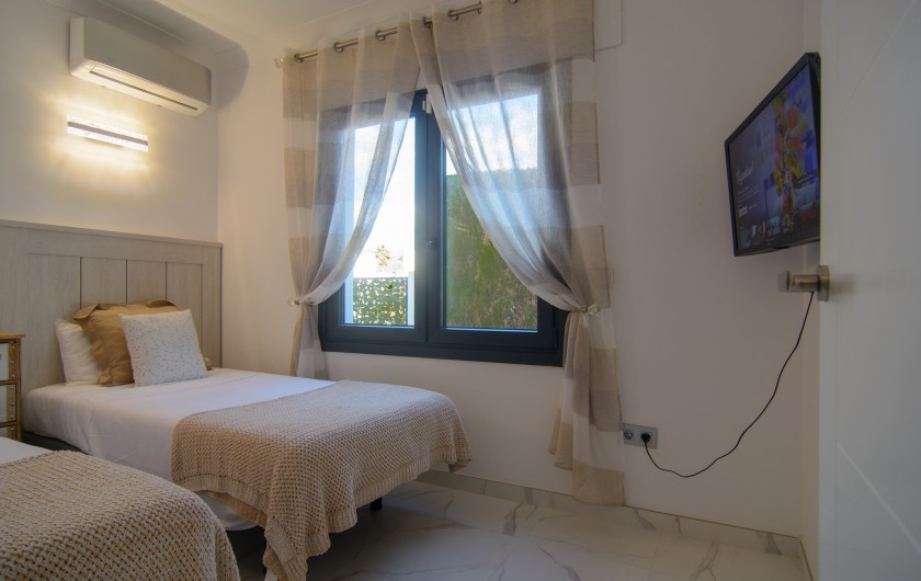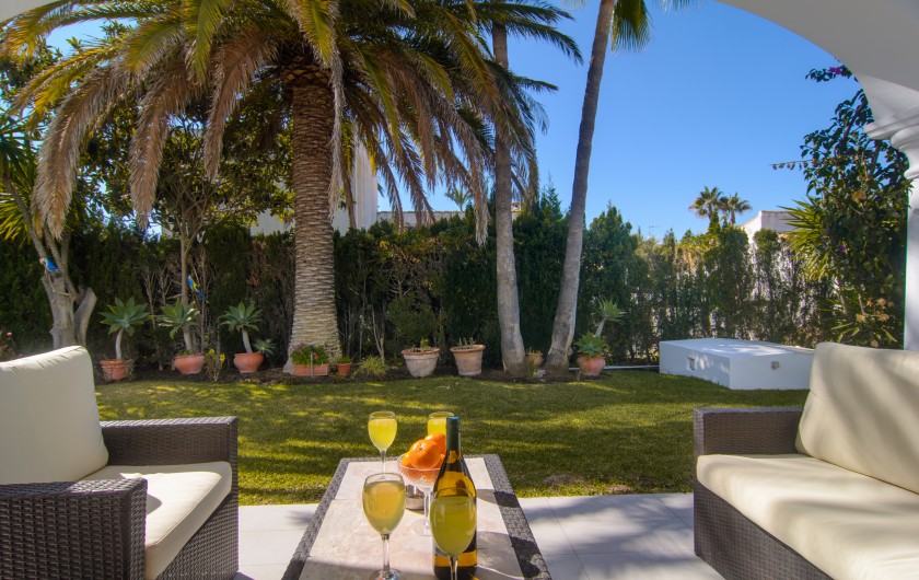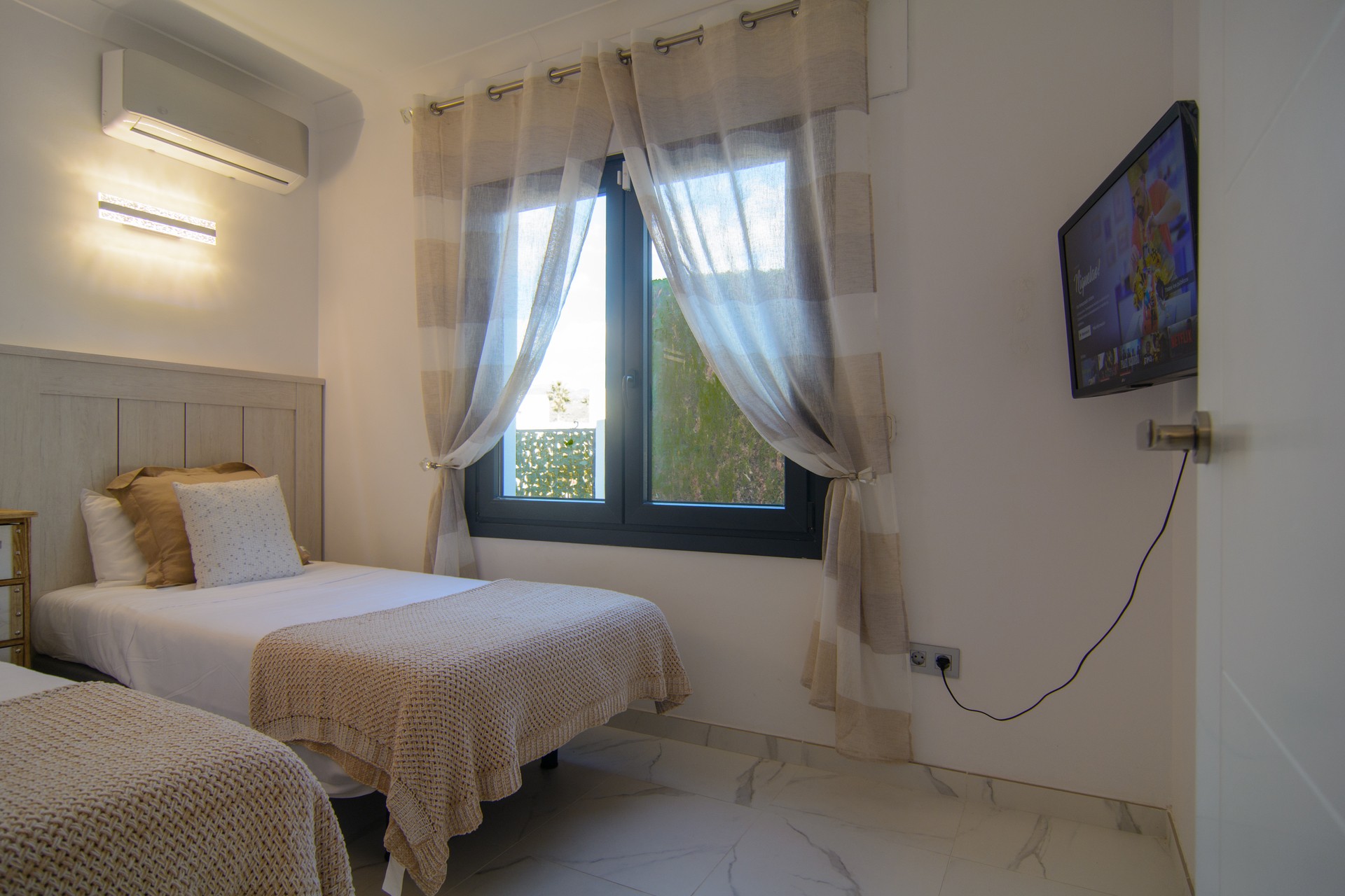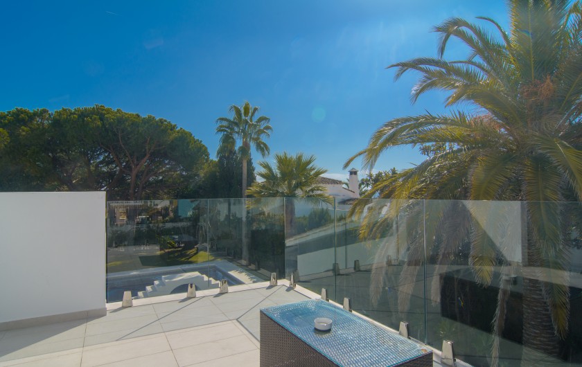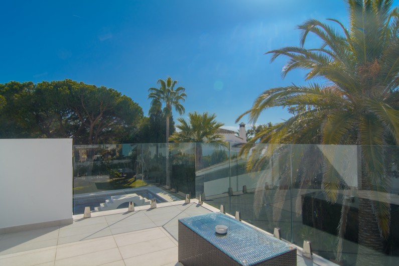 La terrasse supérieure (12m2) au premier étage offre de belles vues sur la mer, sur la piscine, le jardin, l'urbanisation et les montagnes. La petite table basse en rotin vous permet de profiter des vues parfaites tout en buvant votre café du matin.