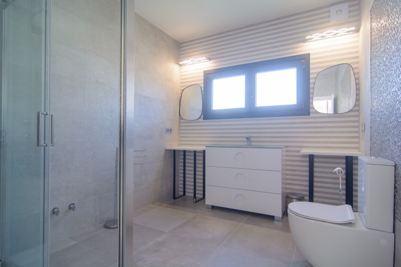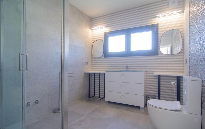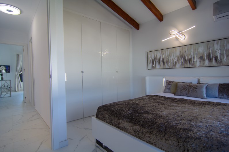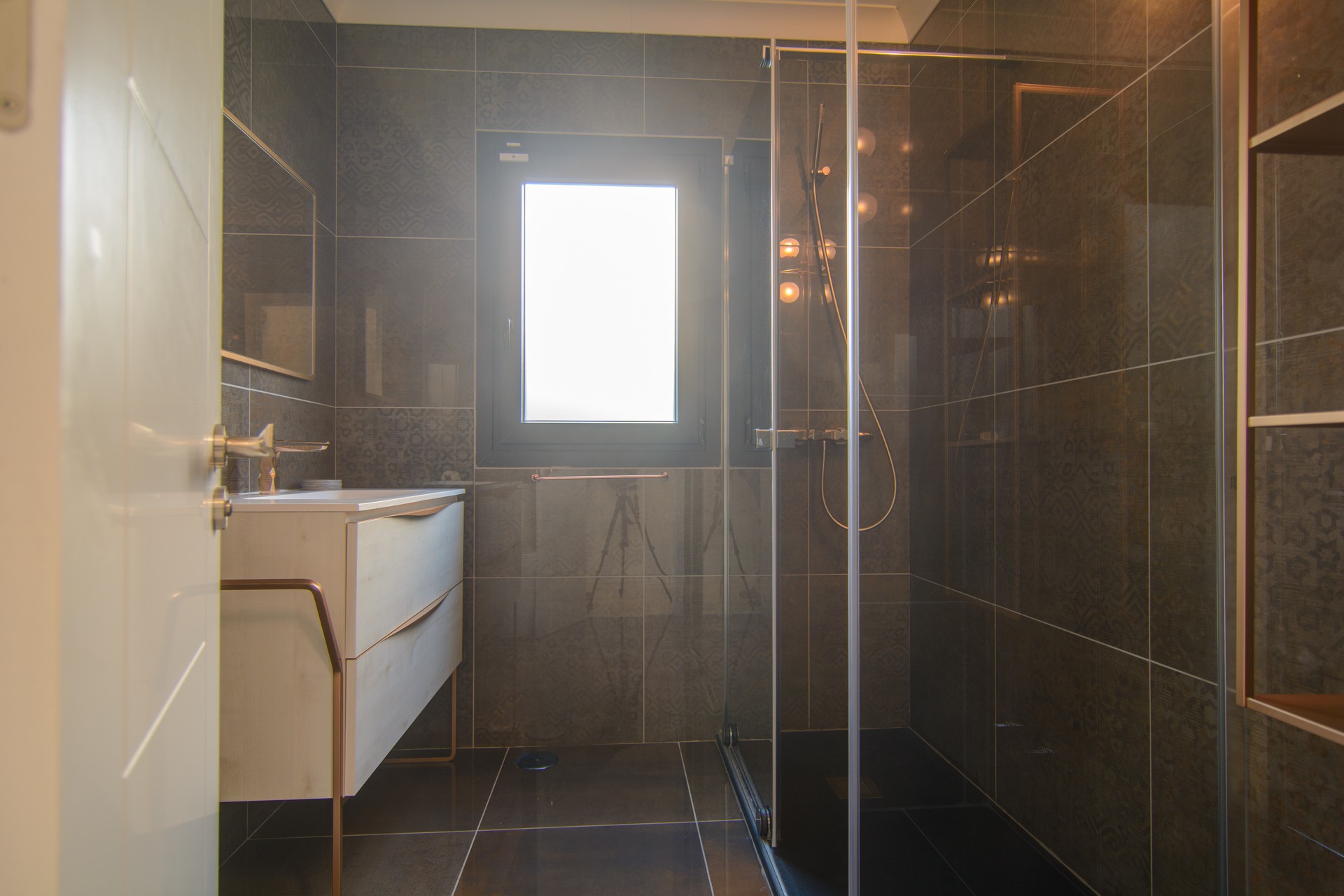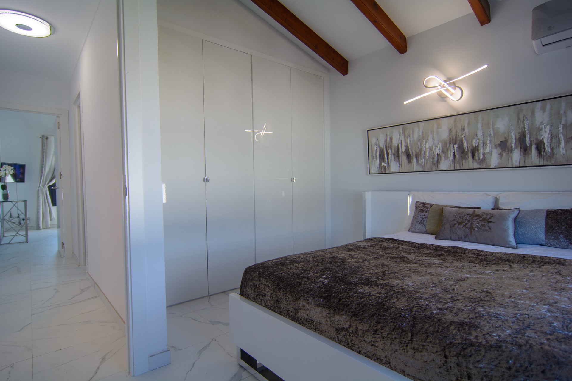 À l'étage, vous disposez de trois chambres, d'une salle de bains en suite, d'une salle de bains familiale et d'une terrasse d'où vous pouvez admirer le beau jardin avec piscine, ainsi que la mer et les montagnes. La chambre principale dispose d'un lit double (180x200cm), de deux tables de nuit, d'une armoire spacieuse, d'une commode, de deux tabourets et d'une télévision à écran plat (iptv avec chaînes internationales). La salle de bains attenante présente un design très attrayant et des finitions parfaites avec des appliques, deux miroirs, une douche à l'italienne avec pommeau de pluie, un lavabo et des toilettes. La deuxième chambre à l'étage dispose d'un lit double (160x200cm) avec une table de nuit, une armoire spacieuse et des poutres en bois apparentes. La troisième chambre à l'étage dispose d'un lit double (140x200cm), d'une armoire spacieuse, d'une table de nuit, d'une table pour ordinateur portable et d'une télévision à écran plat (iptv avec chaînes internationales). Ces deux chambres partagent une salle de bains familiale qui comprend une douche à l'italienne avec pommeau de pluie, un lavabo, des toilettes et une fenêtre. Toutes les chambres sont climatisées.