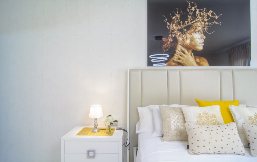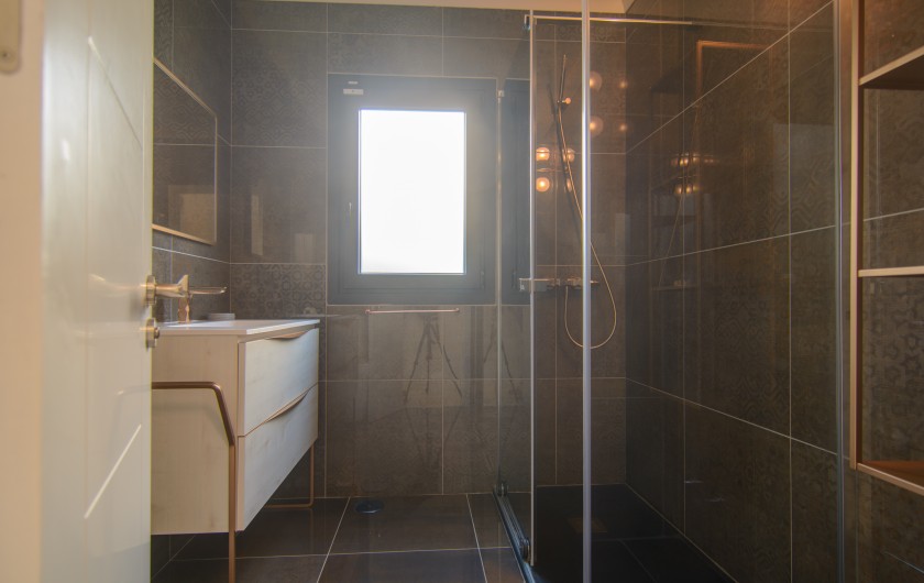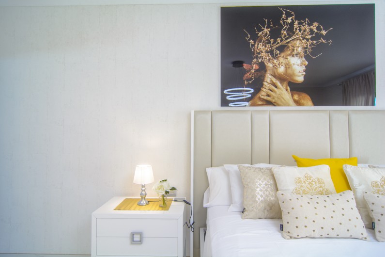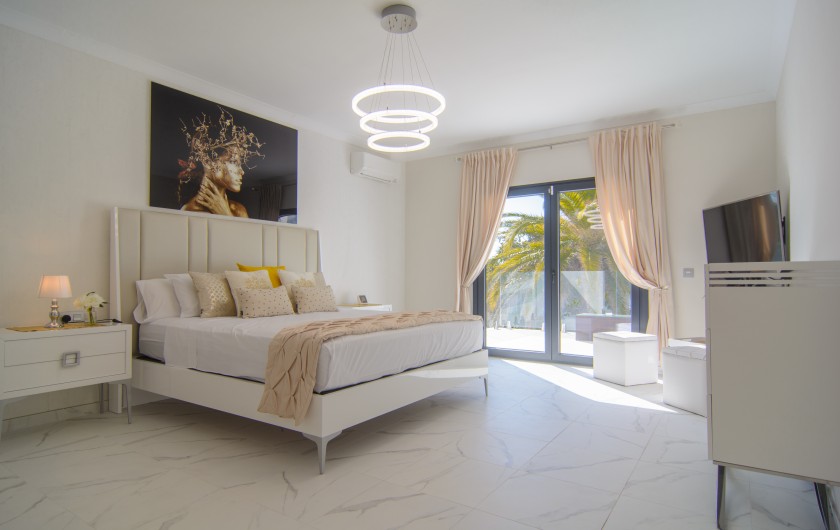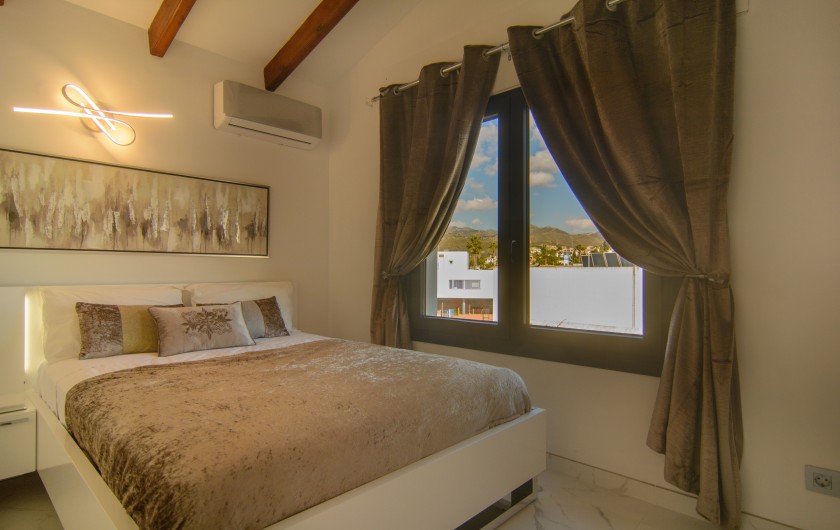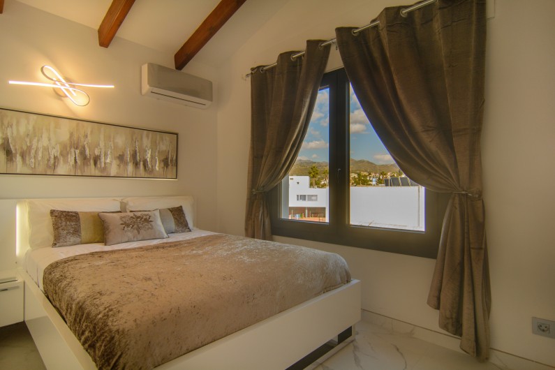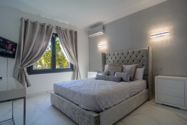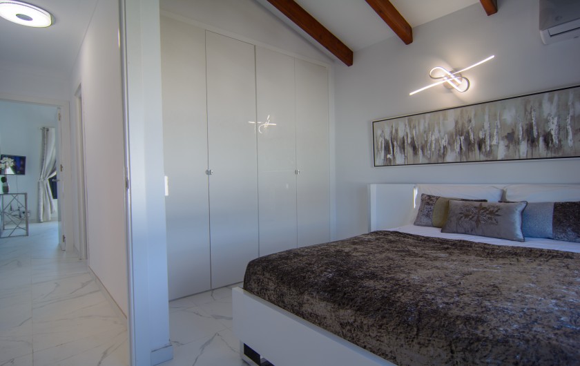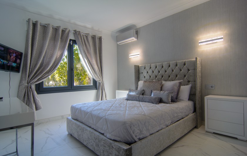 À l'étage, vous disposez de trois chambres, d'une salle de bains en suite, d'une salle de bains familiale et d'une terrasse d'où vous pouvez admirer le beau jardin avec piscine, ainsi que la mer et les montagnes. La chambre principale dispose d'un lit double (180x200cm), de deux tables de nuit, d'une armoire spacieuse, d'une commode, de deux tabourets et d'une télévision à écran plat (iptv avec chaînes internationales). La salle de bains attenante présente un design très attrayant et des finitions parfaites avec des appliques, deux miroirs, une douche à l'italienne avec pommeau de pluie, un lavabo et des toilettes. La deuxième chambre à l'étage dispose d'un lit double (160x200cm) avec une table de nuit, une armoire spacieuse et des poutres en bois apparentes. La troisième chambre à l'étage dispose d'un lit double (140x200cm), d'une armoire spacieuse, d'une table de nuit, d'une table pour ordinateur portable et d'une télévision à écran plat (iptv avec chaînes internationales). Ces deux chambres partagent une salle de bains familiale qui comprend une douche à l'italienne avec pommeau de pluie, un lavabo, des toilettes et une fenêtre. Toutes les chambres sont climatisées.