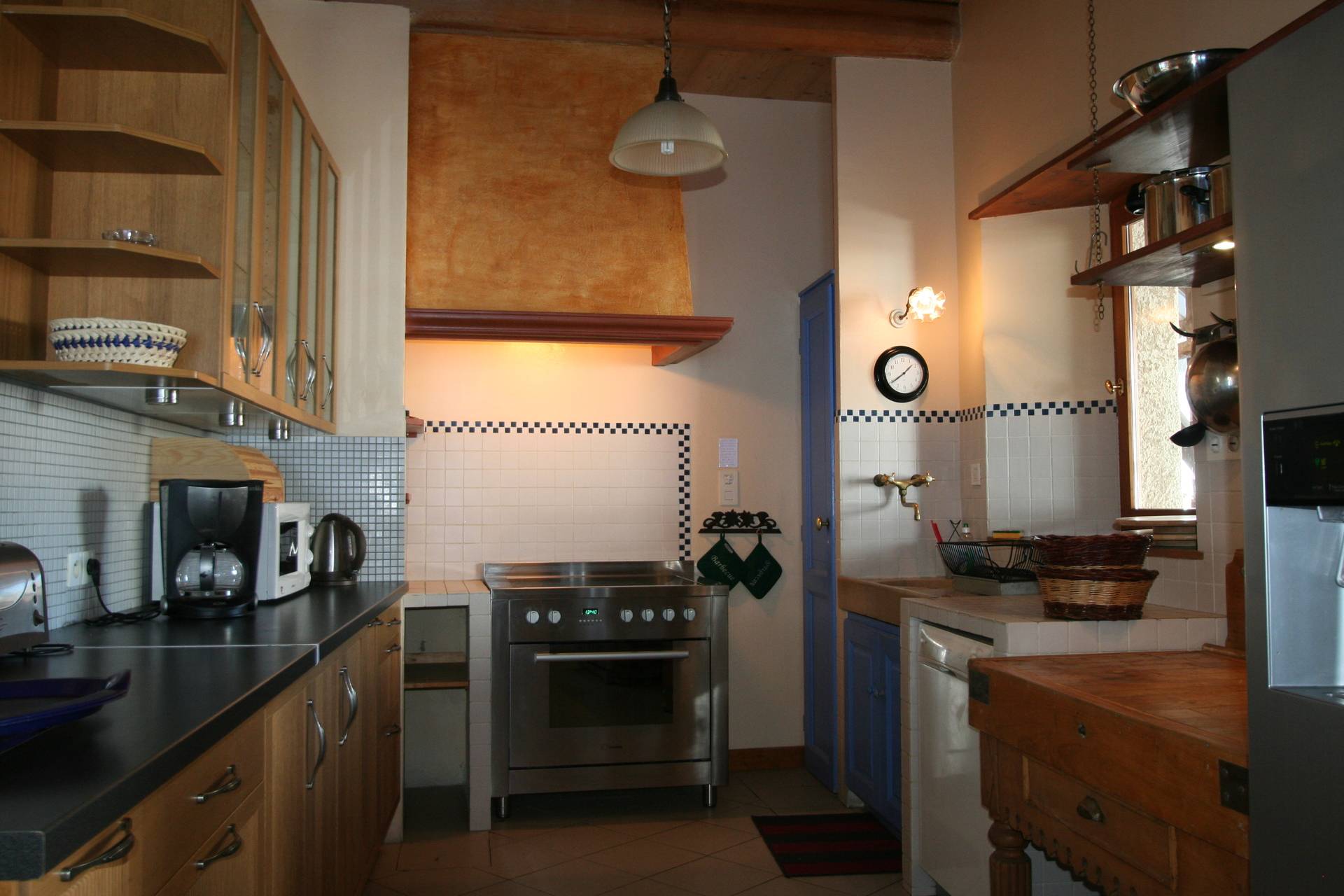 - Cuisine très conviviale comprenant piano de cuisson, véritable billot de boucher, évier en pierre, frigo américain, très grand meuble de rangement.