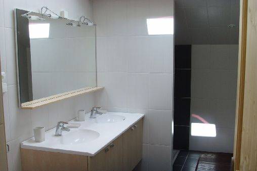 - Une salle de bain avec douche italienne spacieuse, un lavabo double sur meuble, un sèche-serviettes électrique ; un WC.