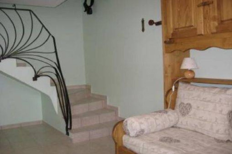 1) un hall avec placards à skis. un salon avec un canapé gigogne. une salle de bains avec baignoire.