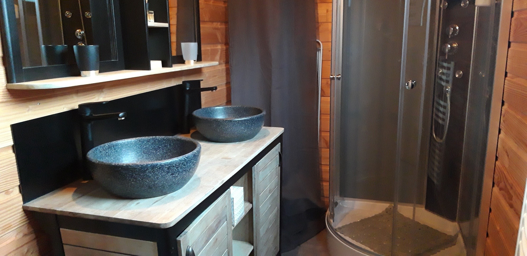 * une salle de bain avec wc/douche (multi-jets) et double vasques.