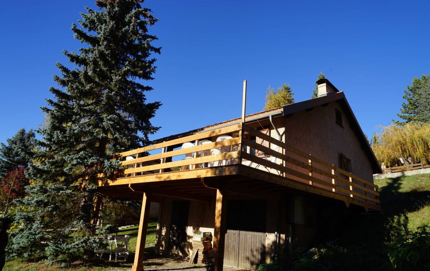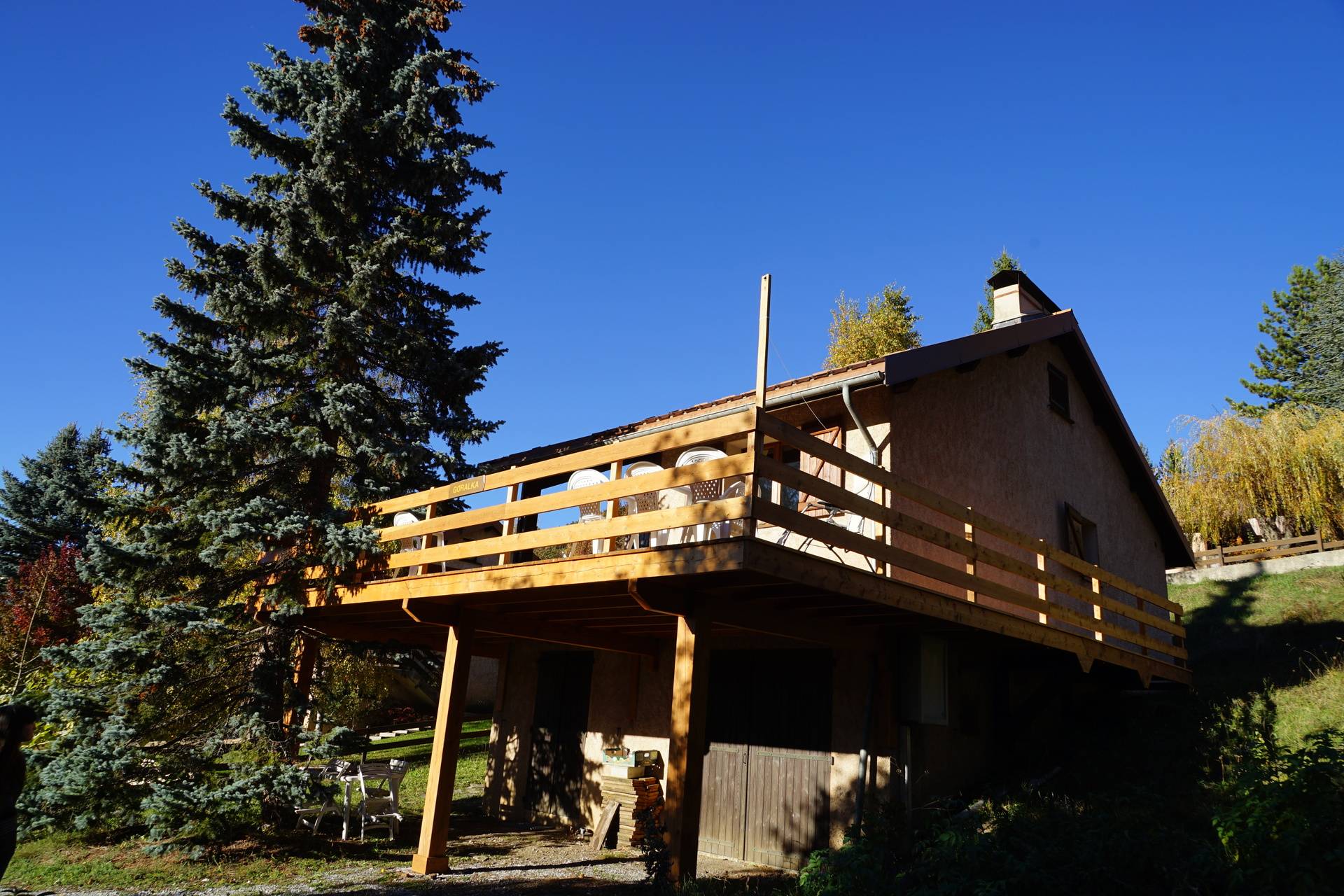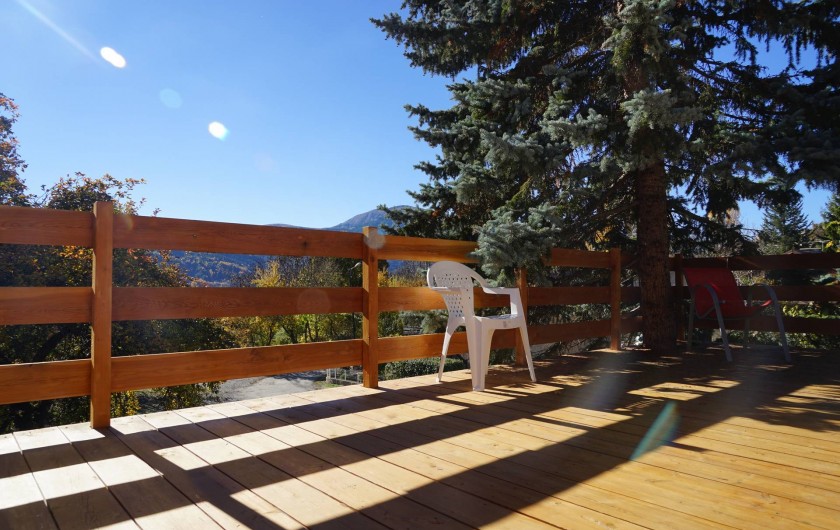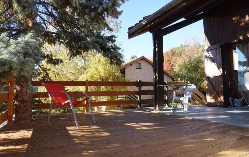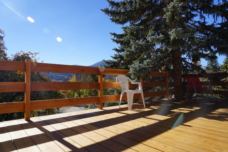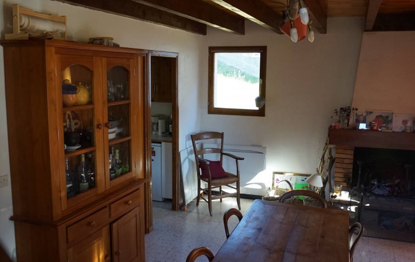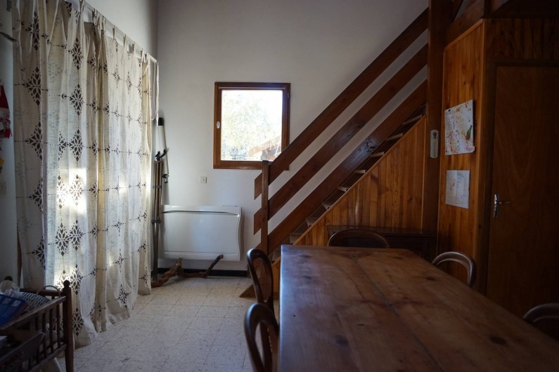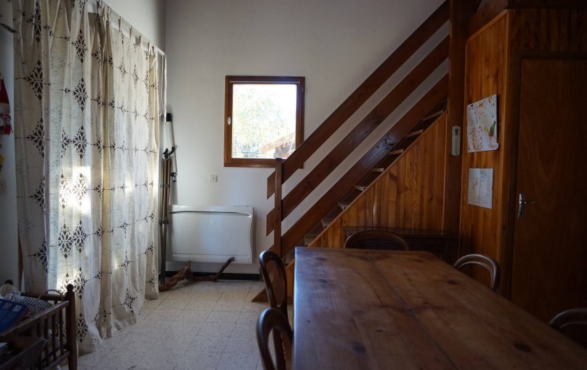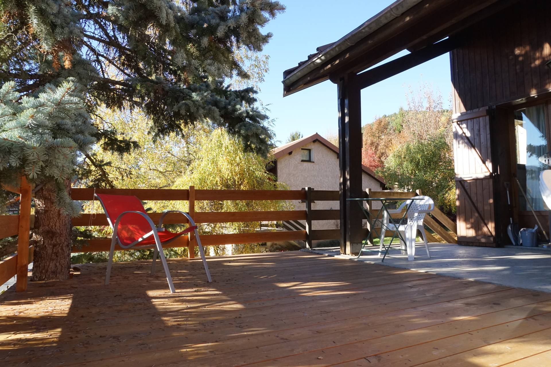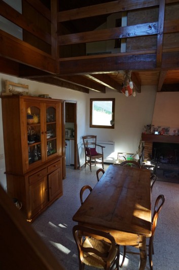 Salle à manger acces sur terrasse extérieure en bois (table chaises de jardin barbecue à gaz)