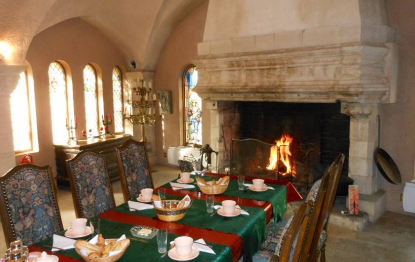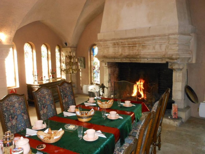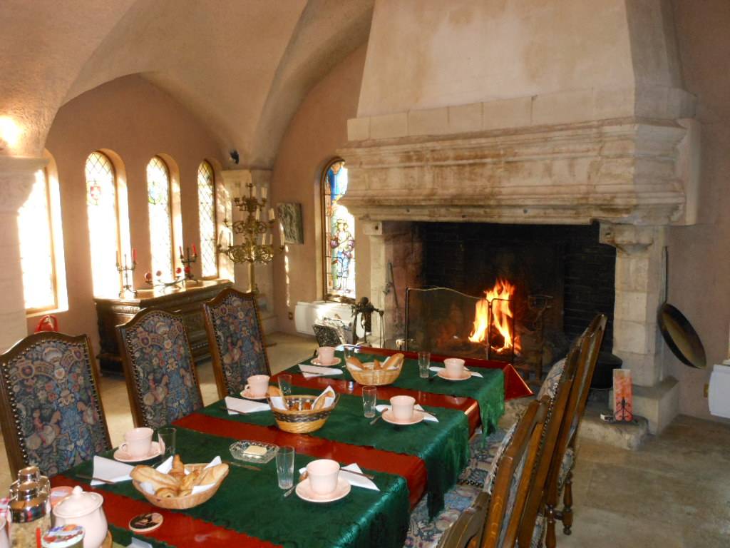 dans la grande salle à manger médiévale avec viennoiseries, gâteaux et confitures maison, jus de fruits pressés et laitages bio...