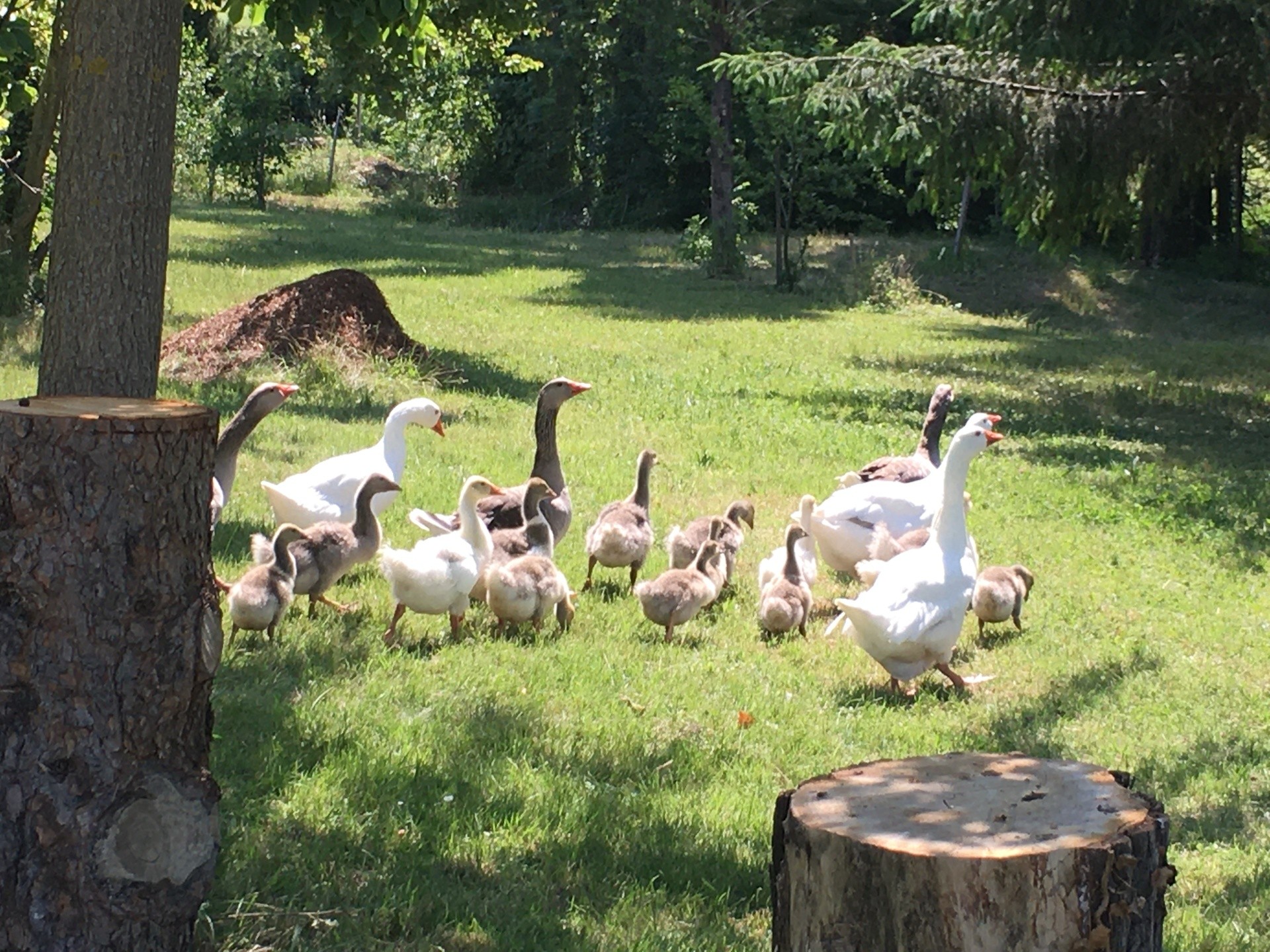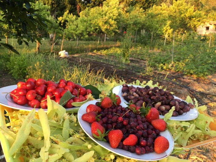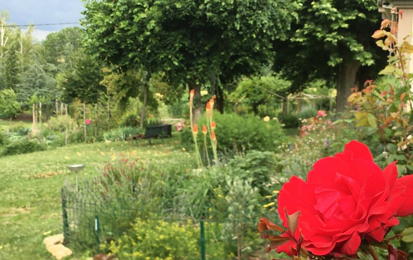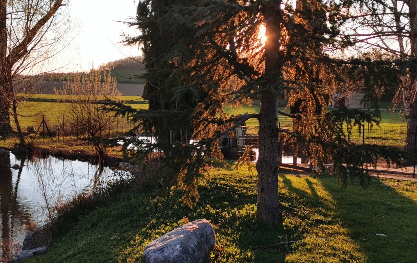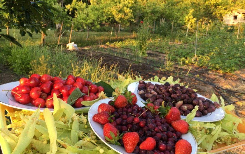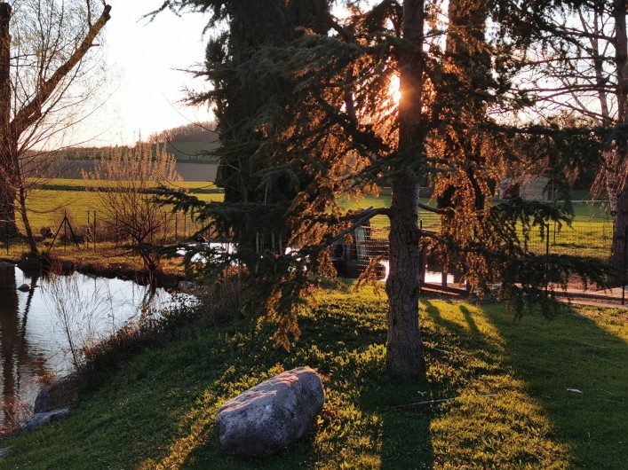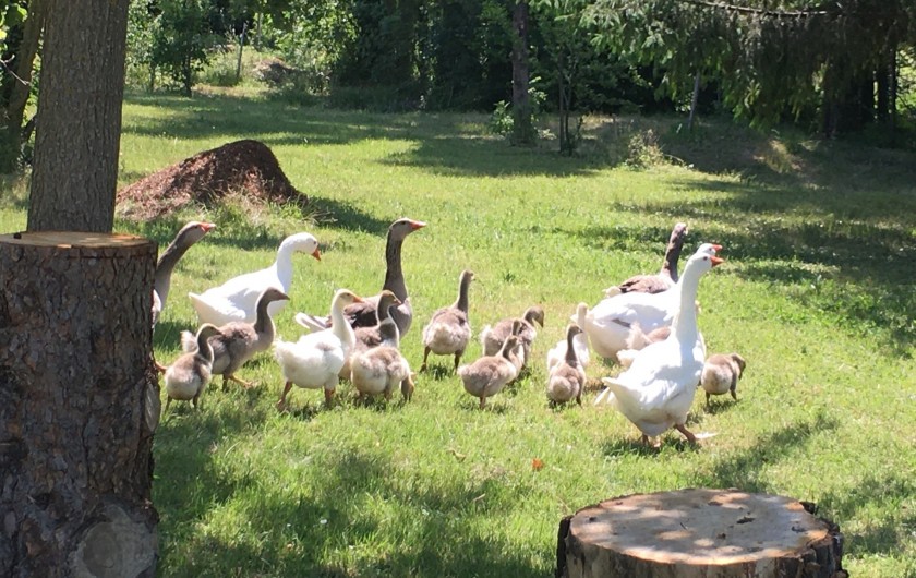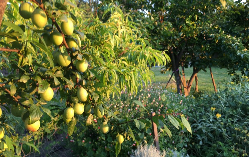 nombreux arbres fruitiers, cabane, divers animaux, la piscine en été. Et la nature tout autour !