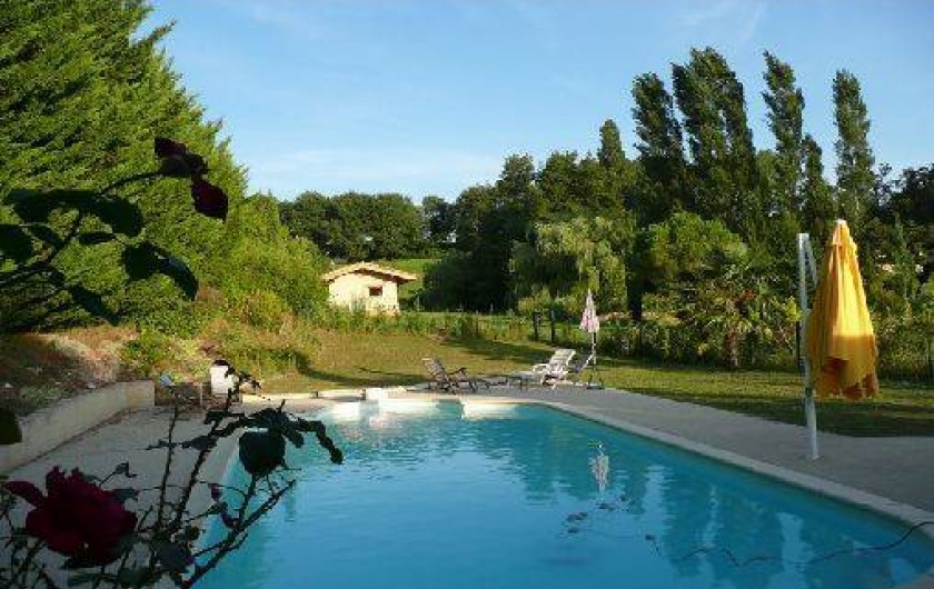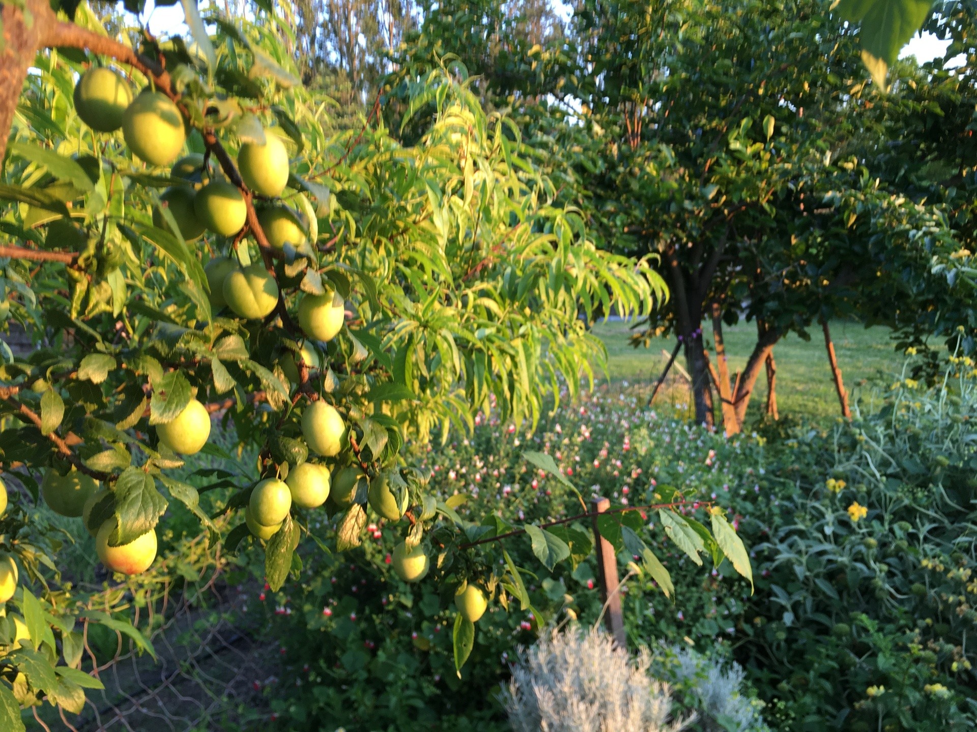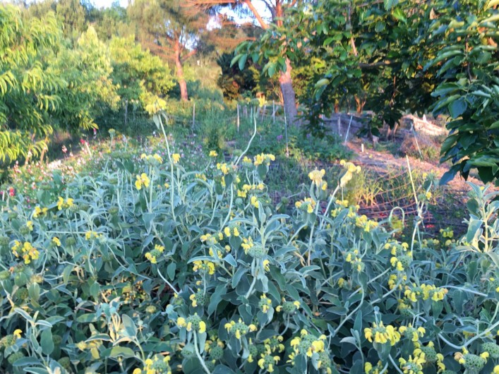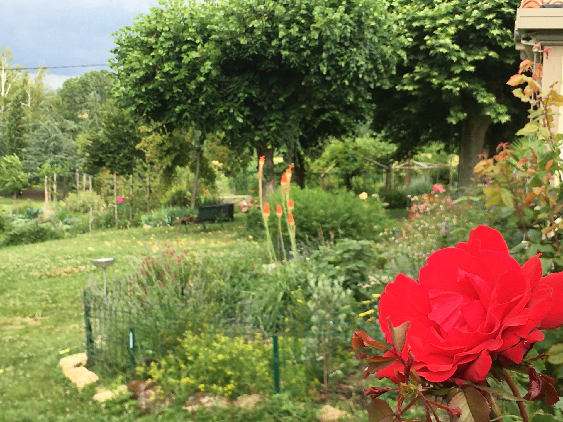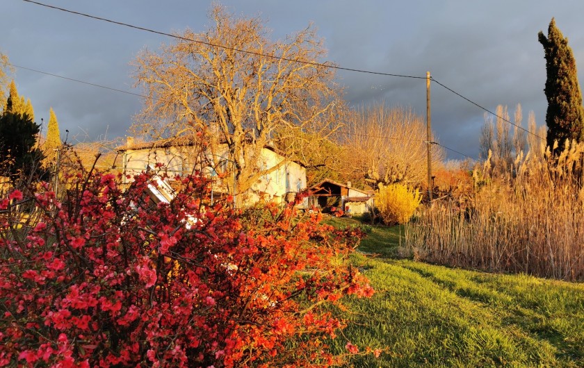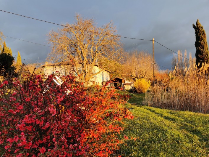 nombreux arbres fruitiers, cabane, divers animaux, la piscine en été. Et la nature tout autour !
