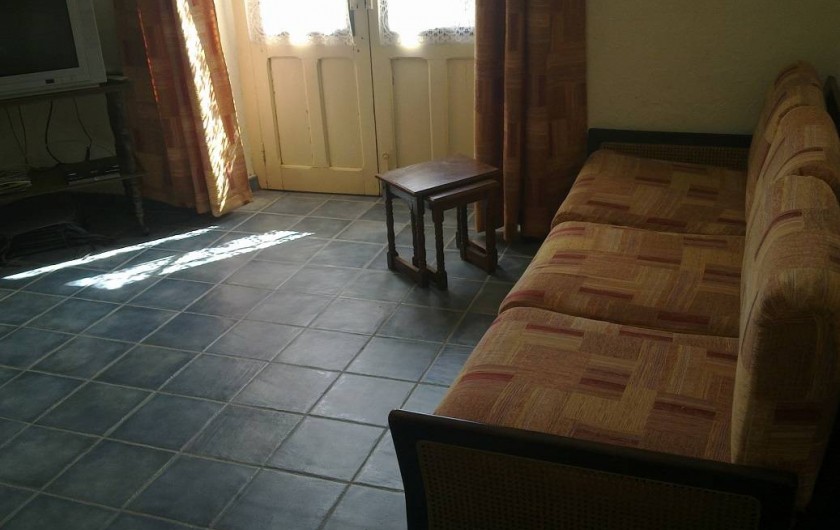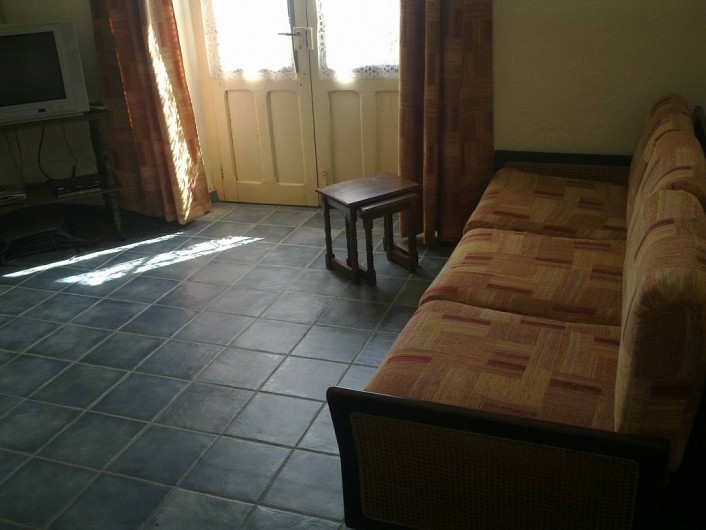 Grand salon avec espace cuisine, cheminée ouverte, TV et petite terrasse couverte pour la détente.