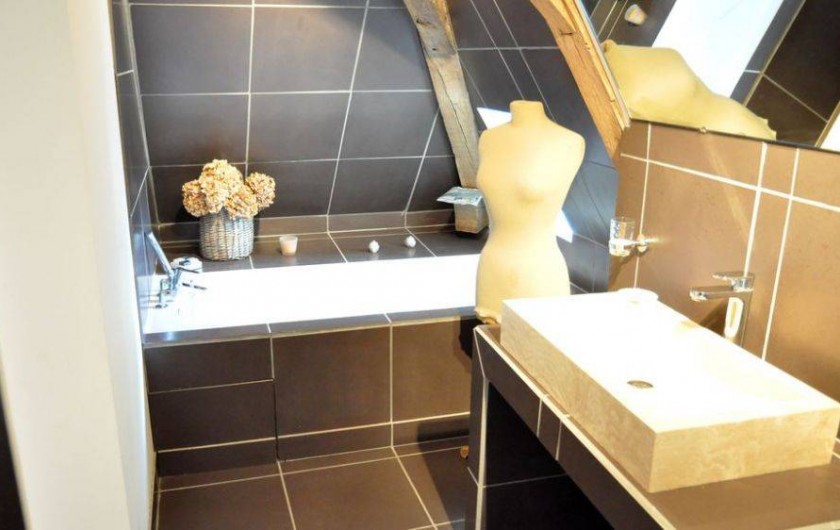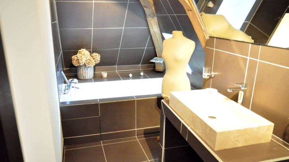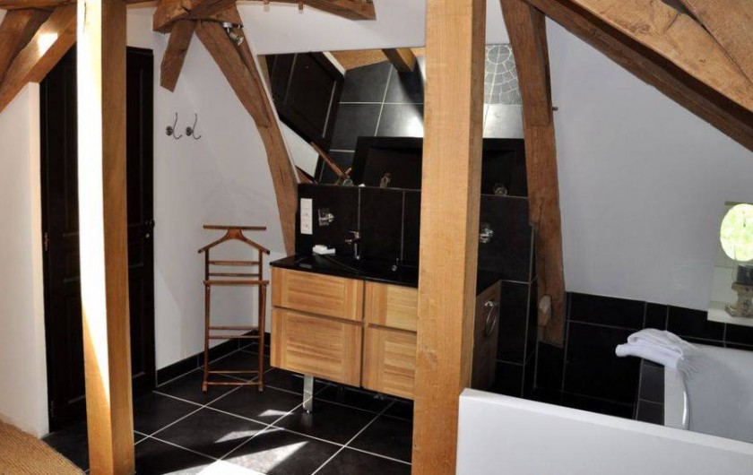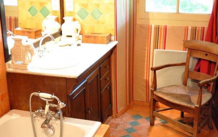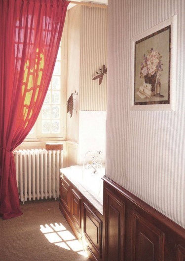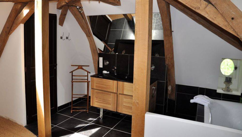 La salle de bain est habillée de boiseries. Douche et baignoire, les toilettes privatives sont indépendantes.