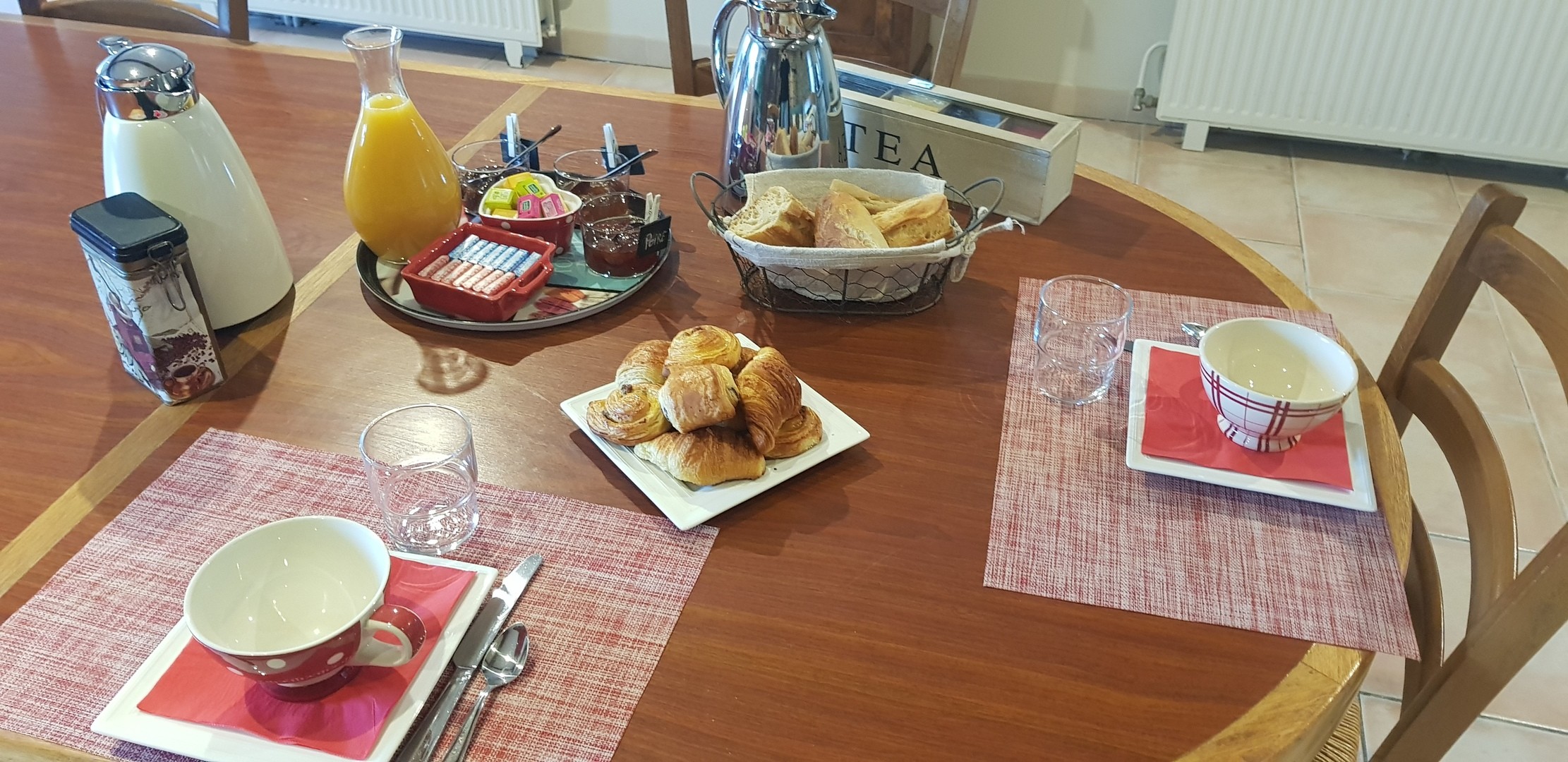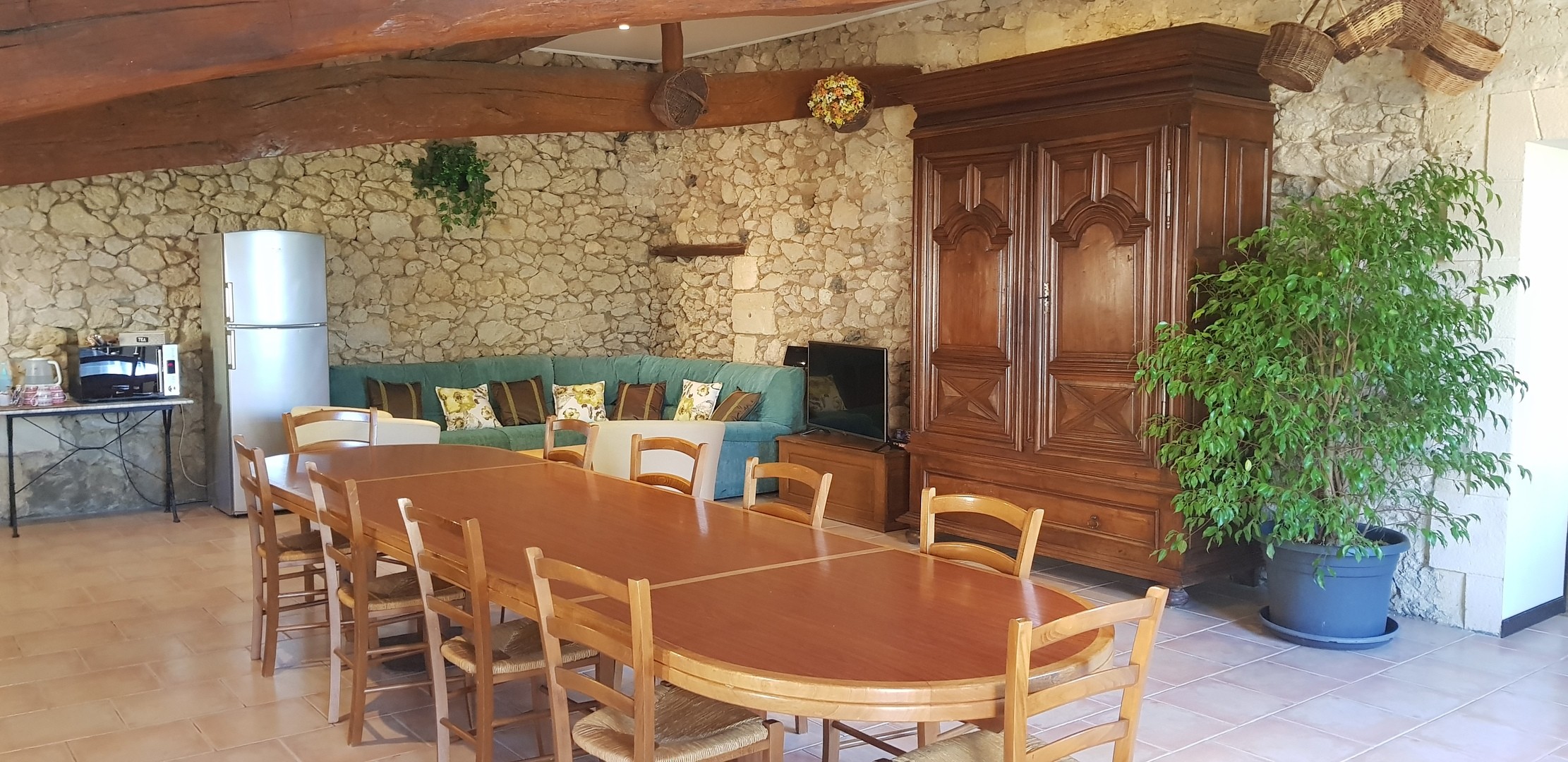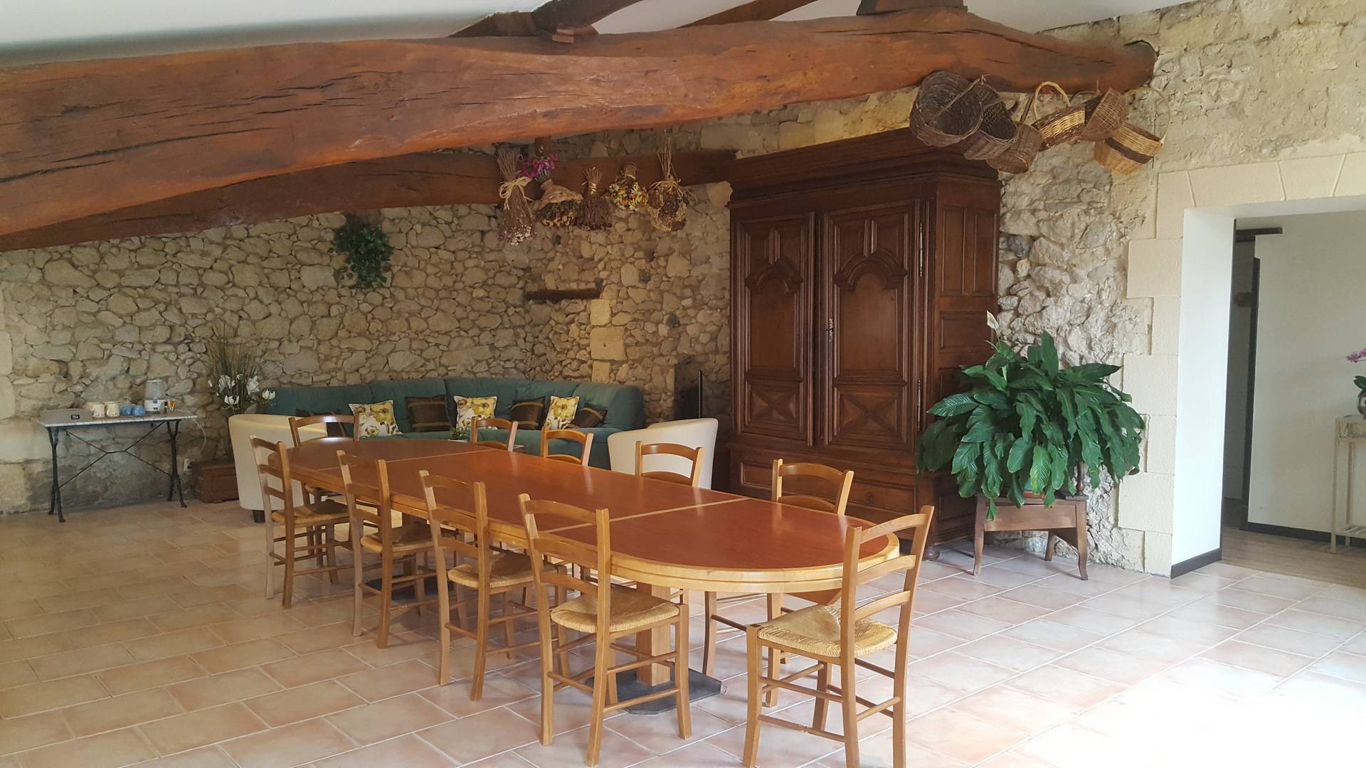 C'est dans une grande salle à manger à l'atmosphère authentique, avec ses murs en pierres et poutres apparentes que les petits déjeuner vous serons servis ainsi que la table d'hôtes du mardi au jeudi sur réservation minimum 6 pers