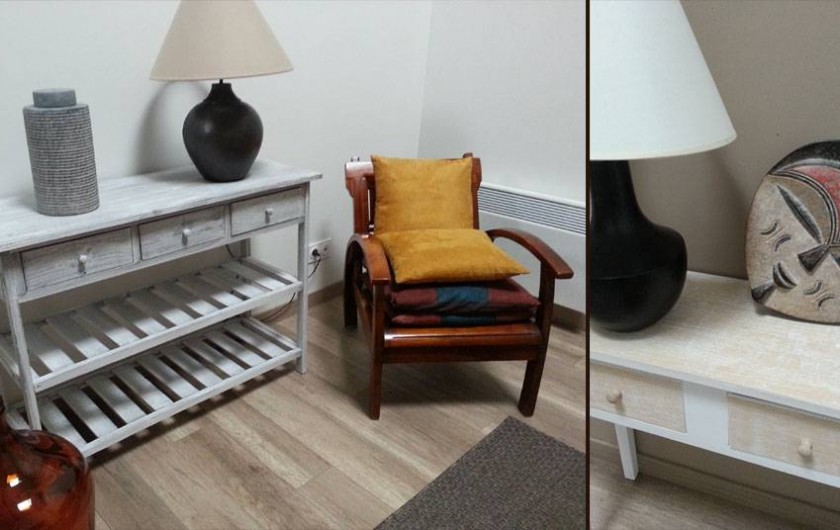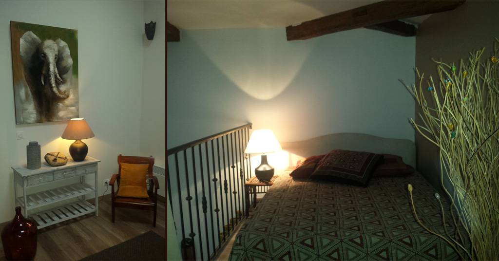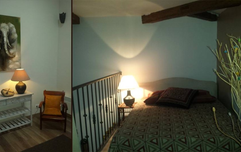 Une mezzanine surplombe la chambre avec un couchage pour 2 adultes ou 2 enfants