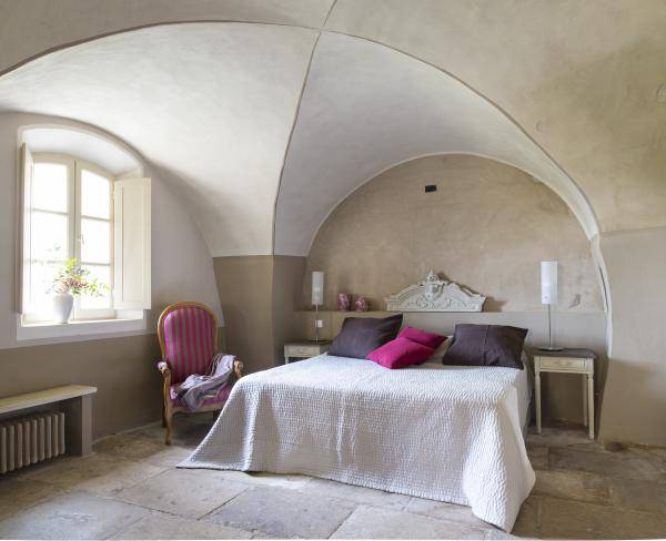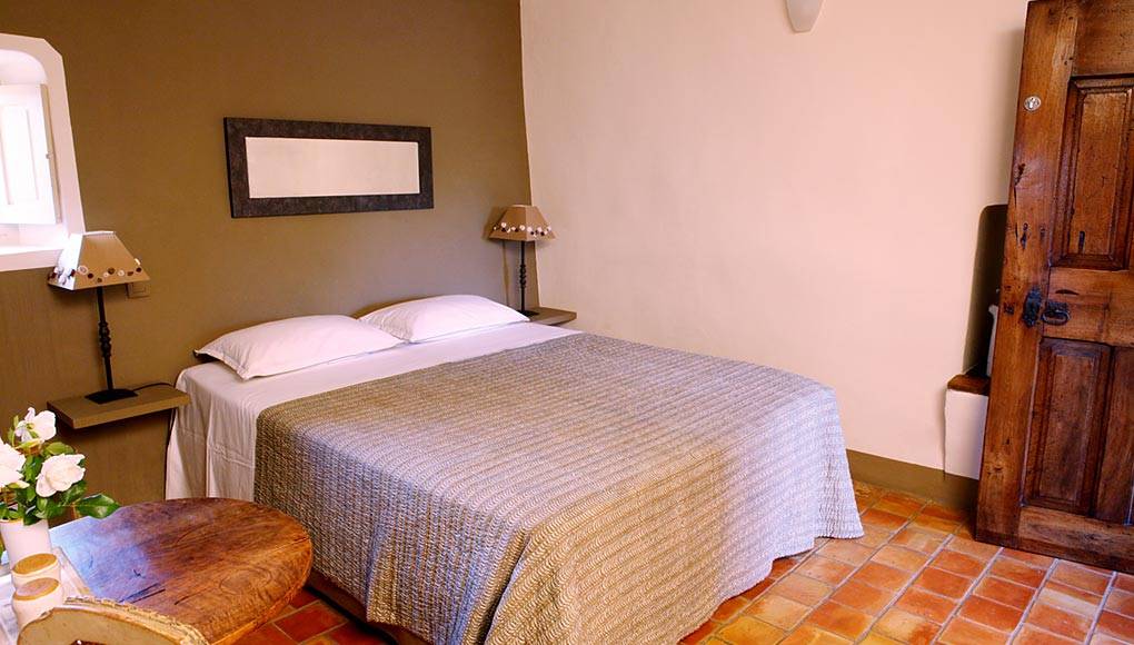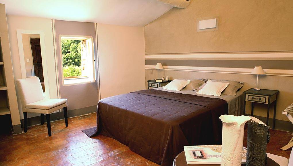 La chambre « Verger » est décorée dans des tons de pierre, avec ses tommettes authentiques.