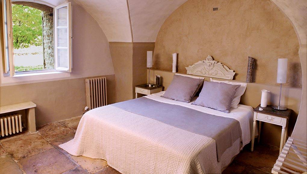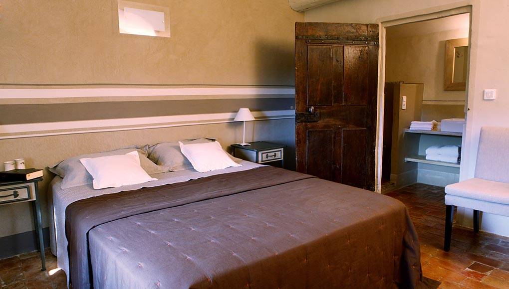 Elégante et douillette, équipée d'un lit double en 160/200 la chambre « Calade » est agréablement décorée dans une ambiance de lin, de bois et de pierre.