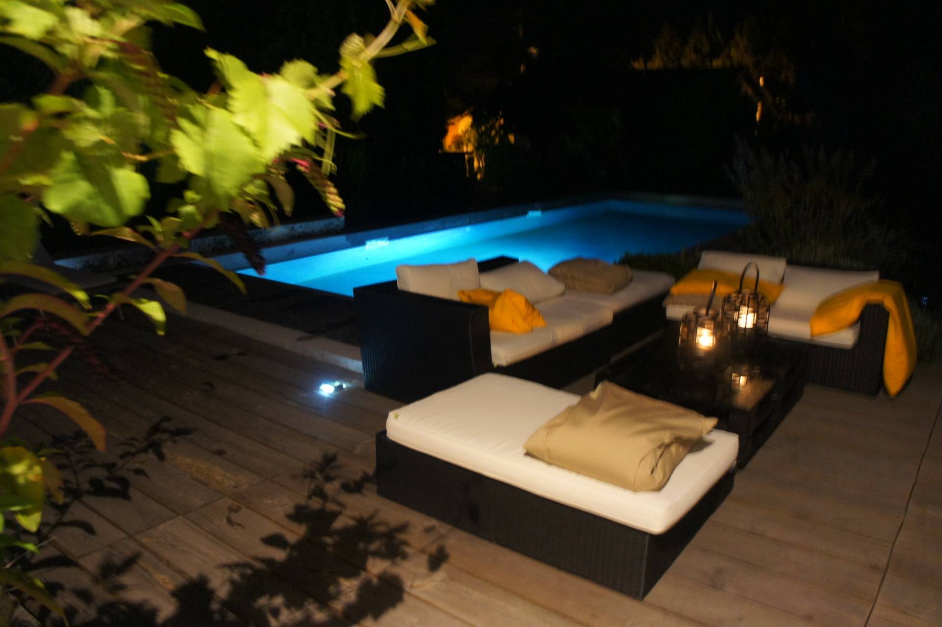 Dans la soirée, alors que les soleils couchants caressent d’un voile rose doré la grande terrasse de bois, la chaleur estivale devenue plus douce invite à profiter du bassin pour une nage ou une relaxation.