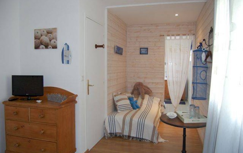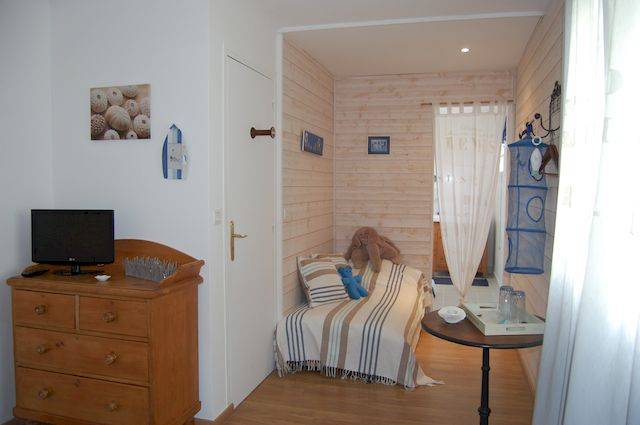 Cette chambre respire l'atmosphere marin. Elle est spacieuse et vous pourrez profiter d'une salle de douche très confortable.