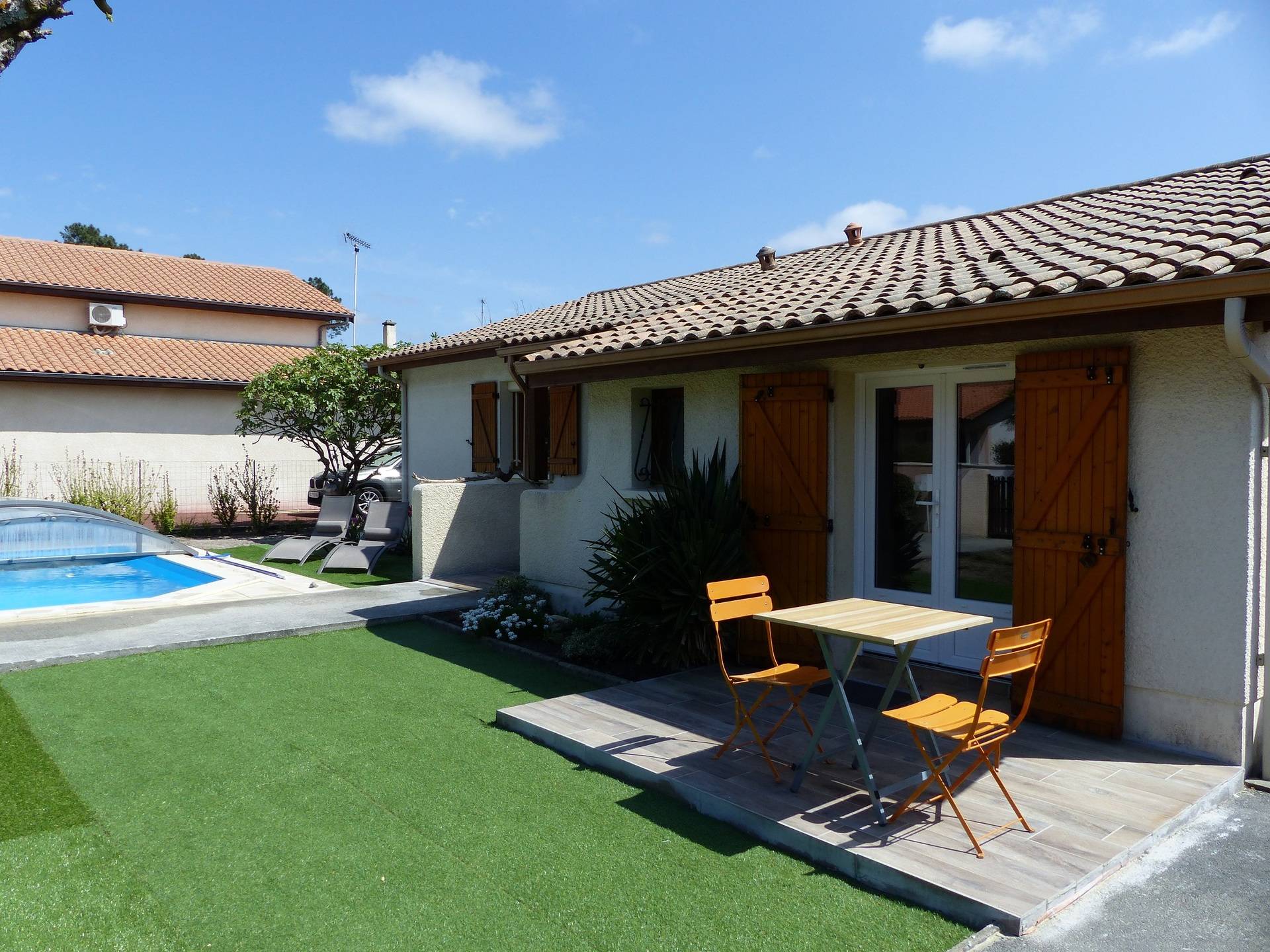 Nous possédons une piscine de 3 x 6 M mise en service en juin 2016 pourvue d'un abri mobile permettant de conserver la température de l'eau et d'une terrasse à l'arrière avec un salon et une table pour 6 personnes