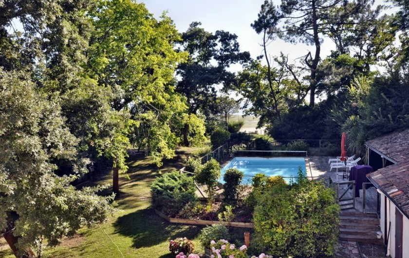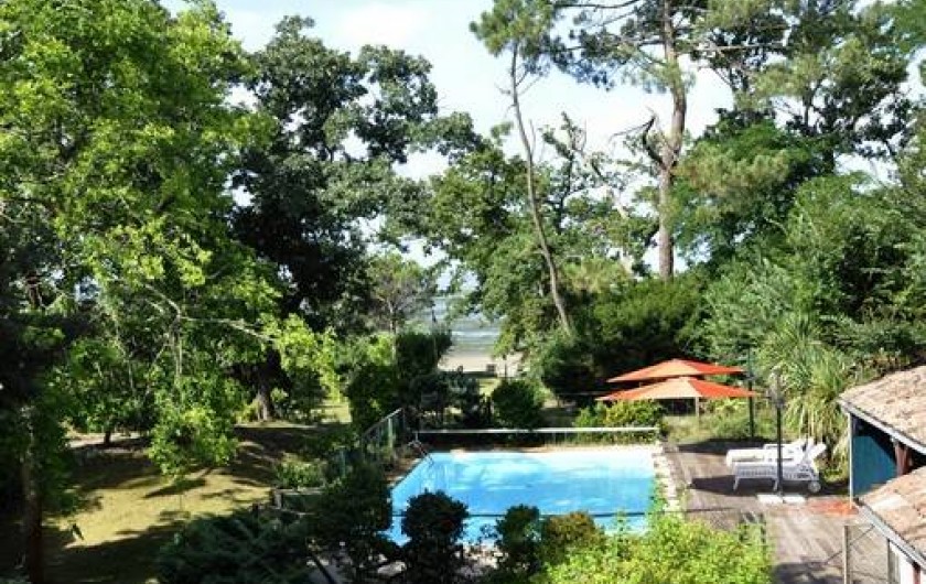 Elle offre, au milieu d’un jardin arboré de 3000 m2, avec un accès direct à la plage, une vue exceptionnelle à 180° sur tout le Bassin.