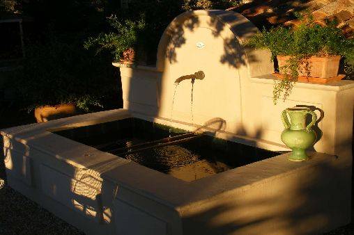 guident les pas du promeneur. Autour de la fontaine, à l’ombre de pins centenaires, chaises longues et fauteuils invitent à la lecture. De longs murs de pierre sculptent le jardin.