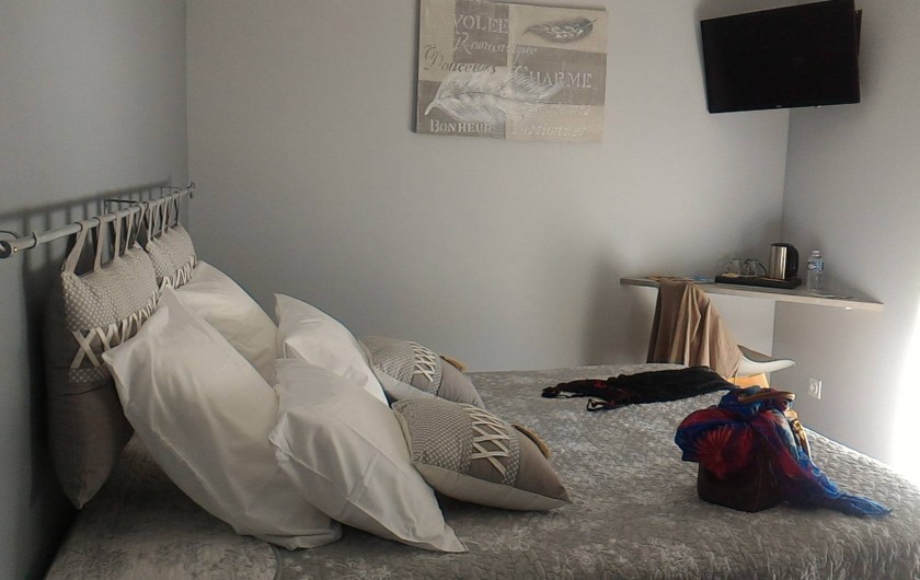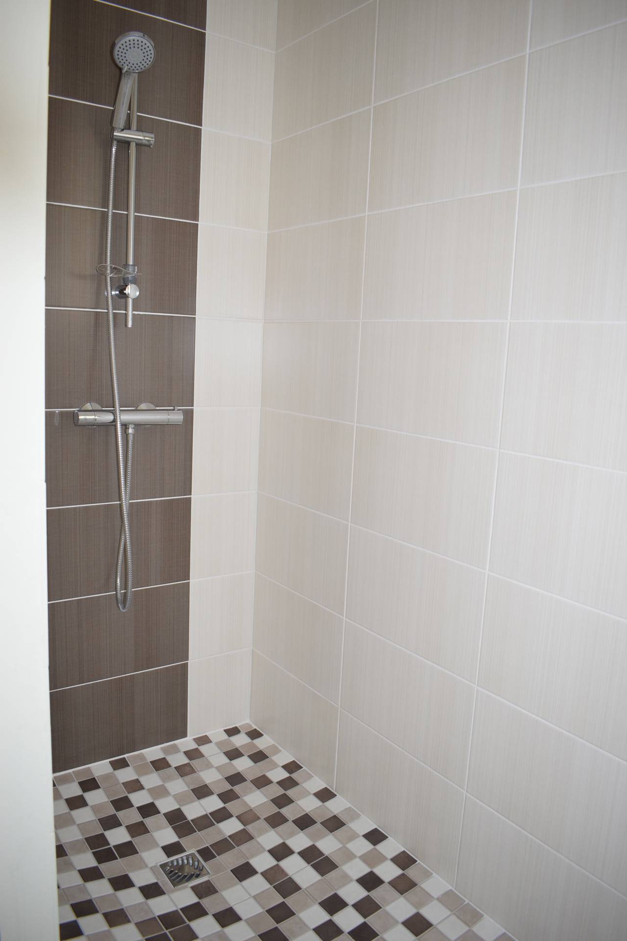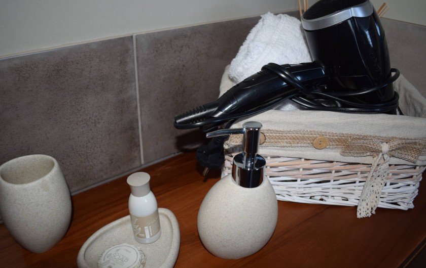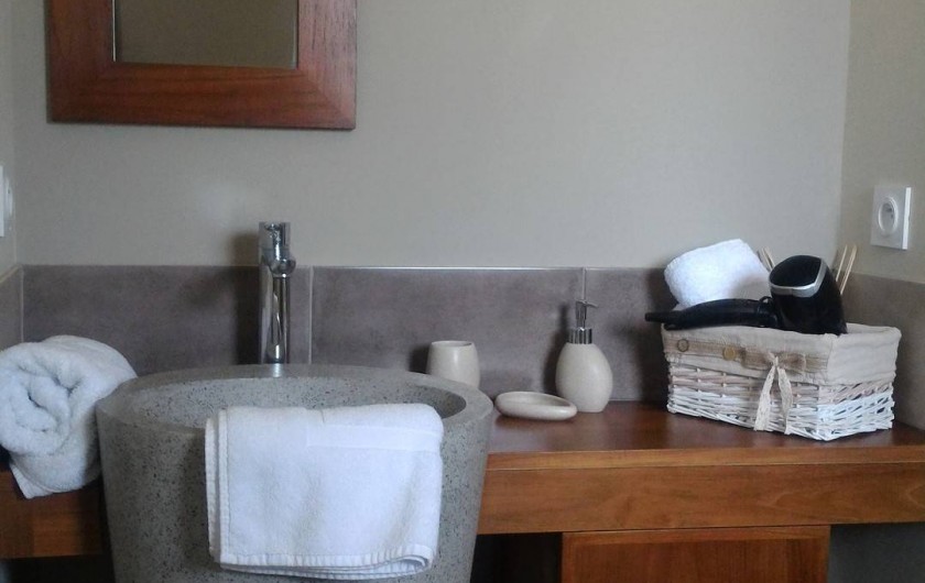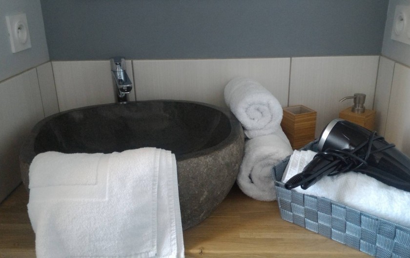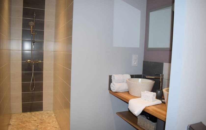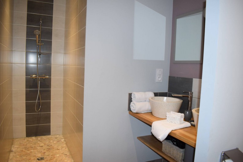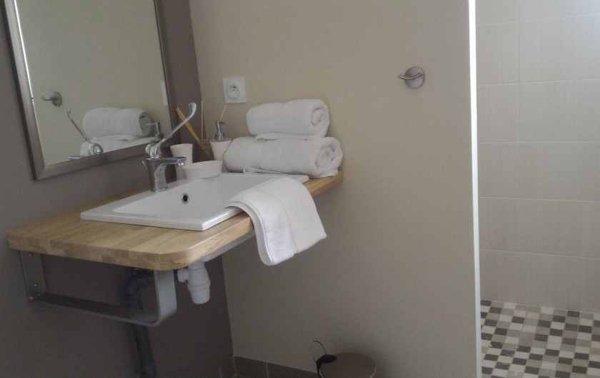 Notre chambre " Brume d'été" possède un salle d'eau accessible au fauteuil roulant (mise à disposition d'un fauteuil roulant spécial douche gratuitement)