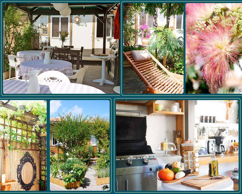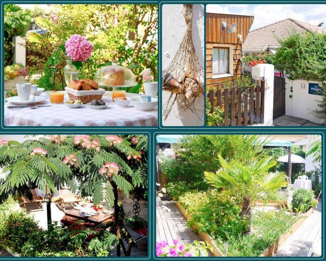 Un jardin fleuri, une terrasse ensoleillée, une tonnelle ombragée et une cuisine extérieure