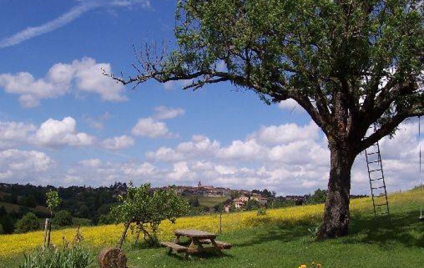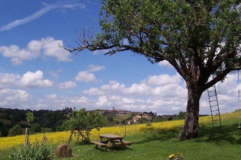 vue panoramique sur la bastide de monpazier 1284 par édouarq1er. table d'hôtes avec les produits de la ferme jardins potager, animaux de basse cour oies, canards didons, moutons, porcs etc servies a la table familialle par simone et jeannot
