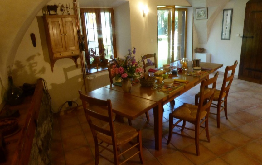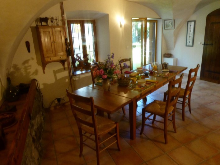 Dans notre salle à manger , nous aurons plaisir à partager le petit-déjeuner et si vous le désirez , le repas du soir que nous préparons avec des produits locaux ou du jardin . Quand le temps le permet , ces moments de convivialités se font dans le jardin ou sous la tonnelle .