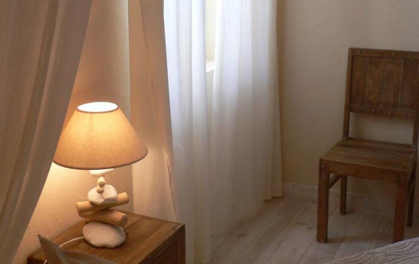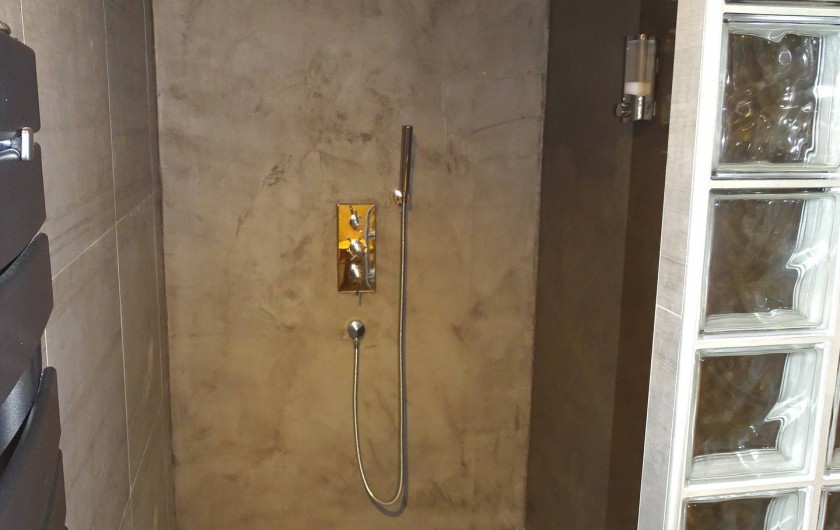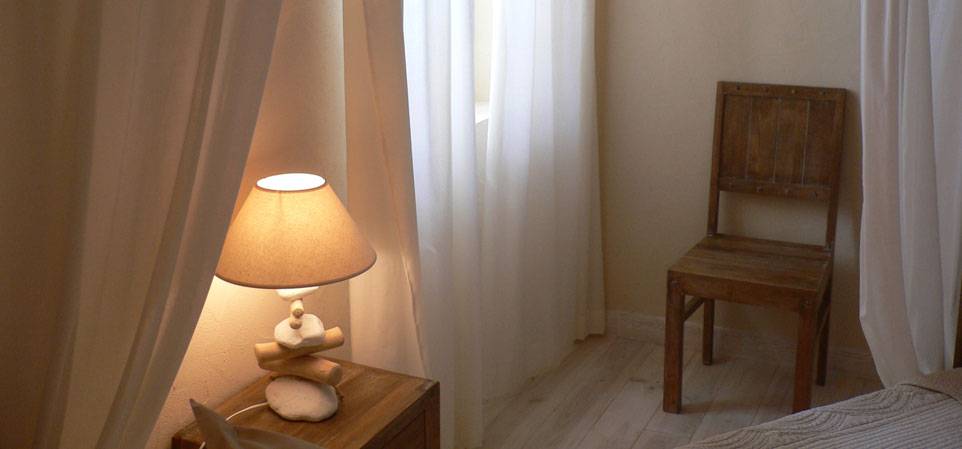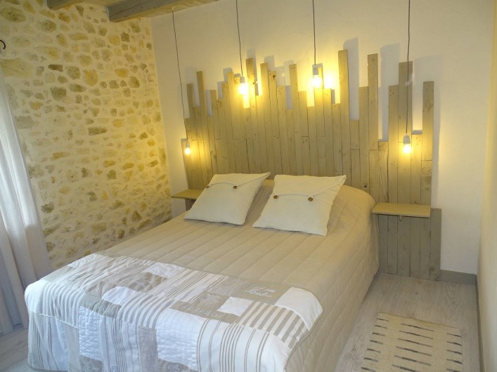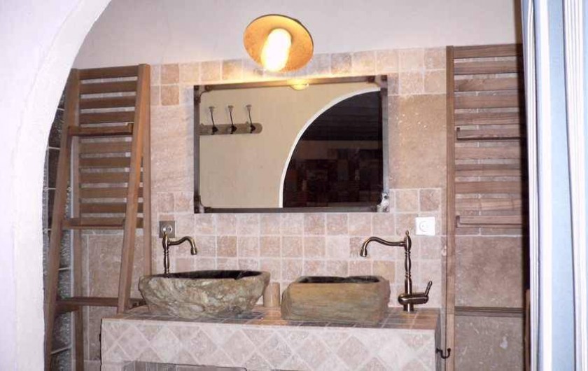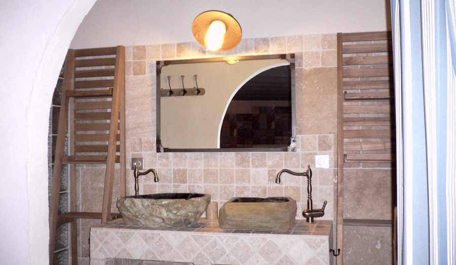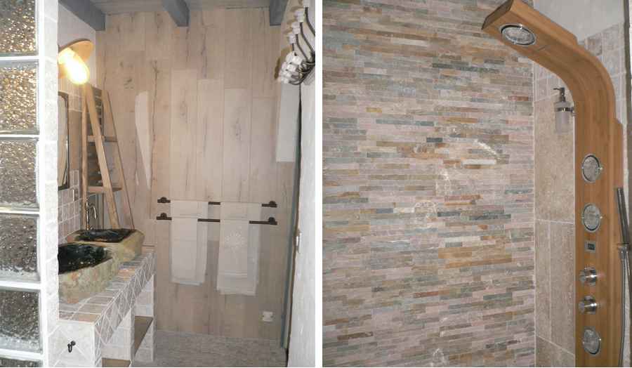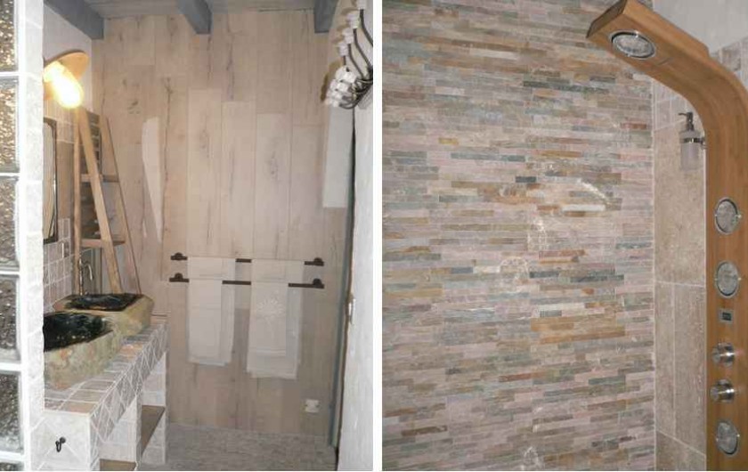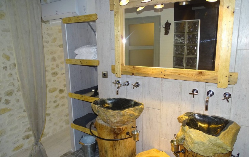 Chambre "Fleur de lin" face est côté piscine, lits 2x80 électriques, dressing, salle d'eau avec douche à l'italienne, 2 vasques en bois fossilisé, wc fermé, clim