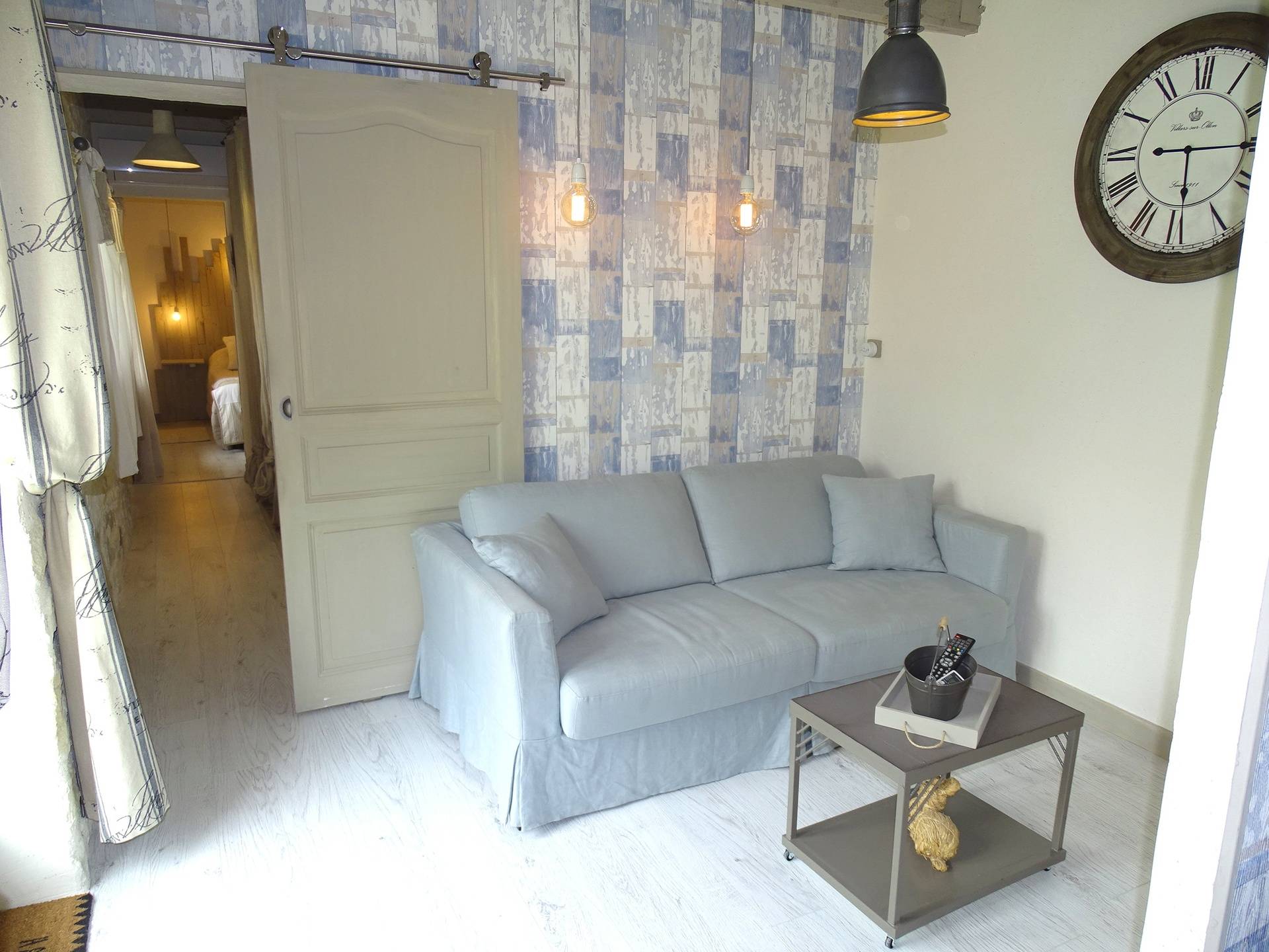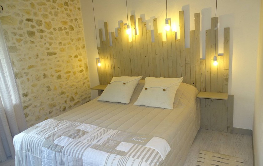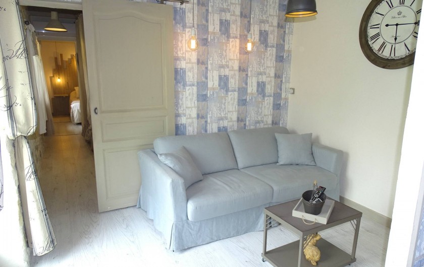 Suite "Espérance" face ouest côté jardin, composée d'un salon avec convertible, dressing, salle d'eau avec douche à l'italienne, 2 vasques en pierre fossilisée, sèche serviettes, wc fermé, chambre avec lit en 160, armoire, TV, clim réversible.