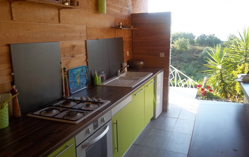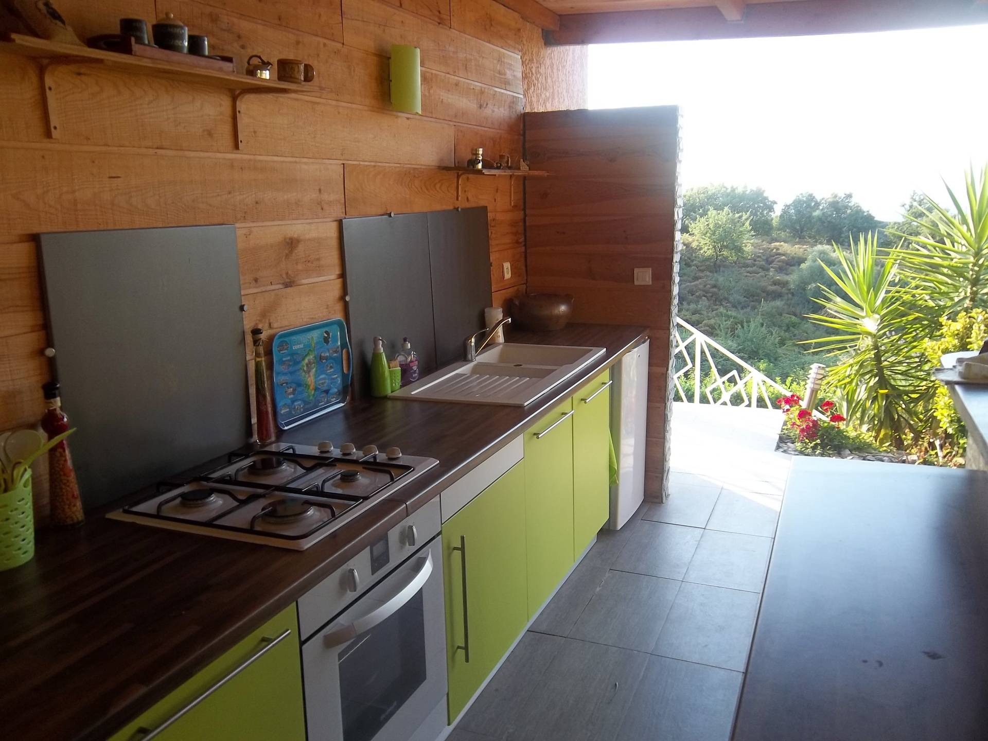 Cuisine d'été, avec une plaque de cuisson, un micro-ondes et un réfrigérateur.