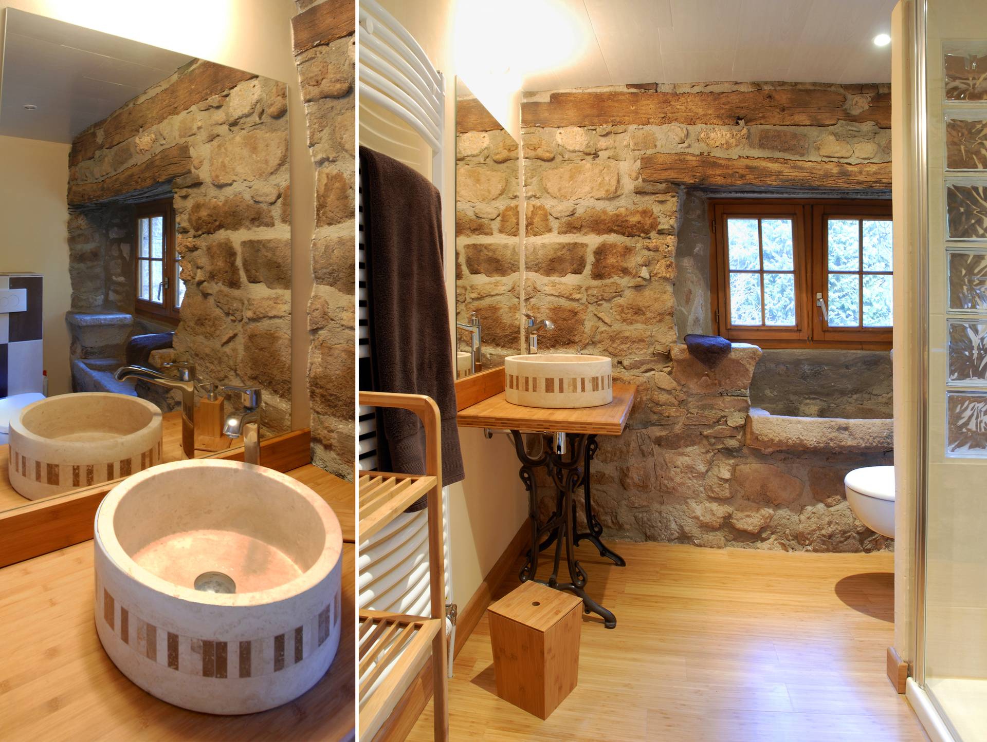 Salle de bains privative dans la chambre avec grande douche plate, vasque en marbre sur plan en bambou, wc et en déco l’ancien évier de la souillarde sous la fenêtre avec vue sur le ruisseau.