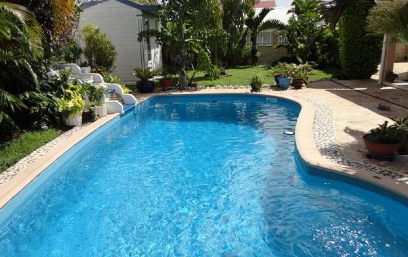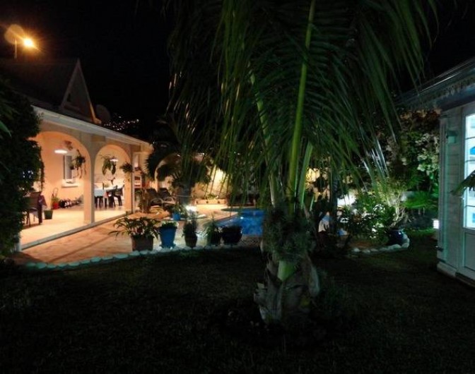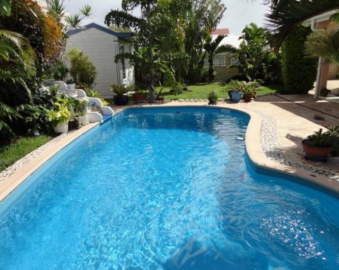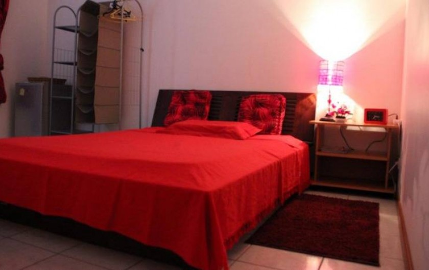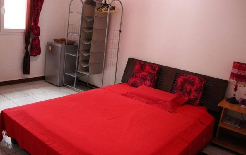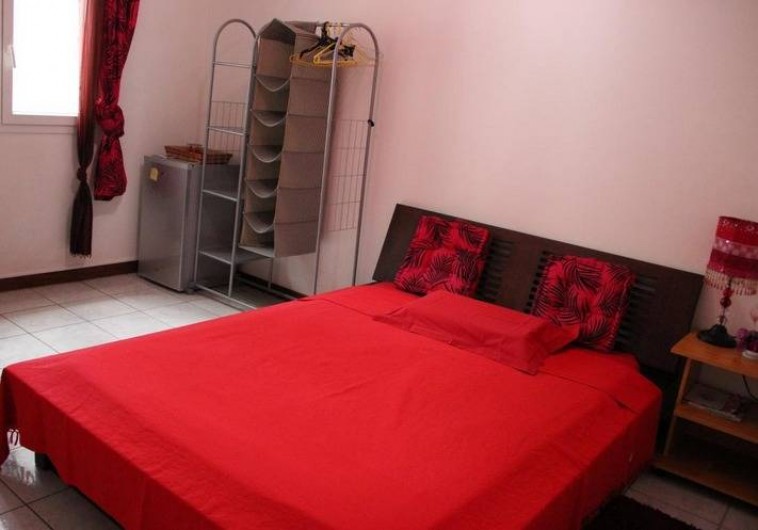 Ex: chambre 1 (située à l'étage) : couple ( lit 2 places) + 2 enfants ou 2 adultes (canapé lit), TV (chaînes câblées), clim, bureau, frigo, internet..