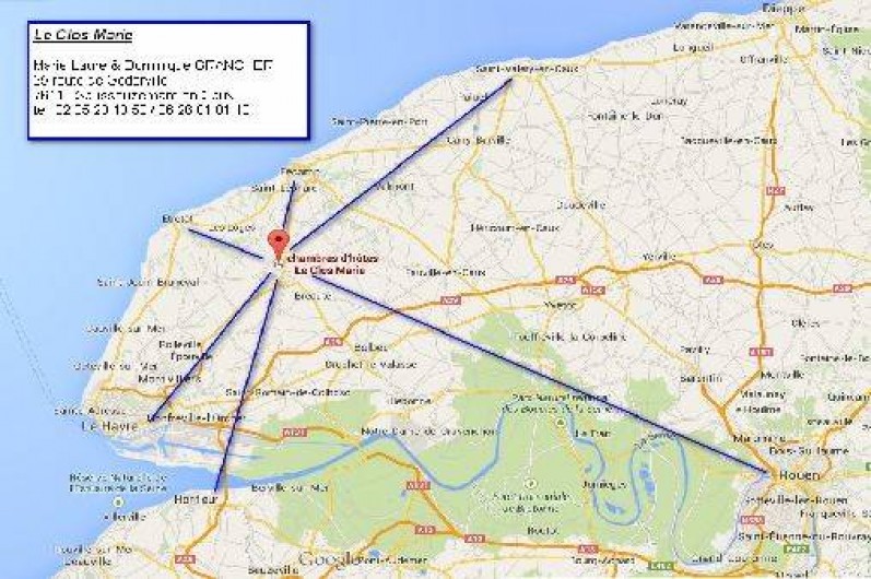 Situé dans la campagne de Normandie à 2 Kms de GODERVILLE, 12 Kms d'ETRETAT, 15 Kms de FECAMP et 30 Kms de HONFLEUR (385 Kms et 4 Hrs de BRUXELLES).