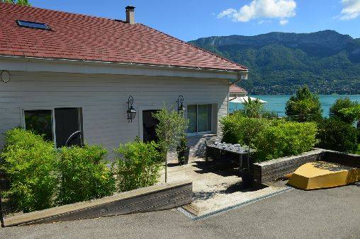 Elle peut accueillir une famille avec 3 enfants. Salle d'eau avec 2 vasques et douche à l'italienne. Vue su le lac et les montagnes et accès par le jardin à la piste cyclable, reliant Annecy en 10 minutes en vélos (prêt de vélos) et au lac (prêt de