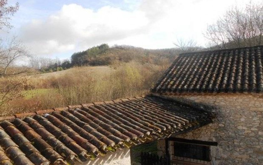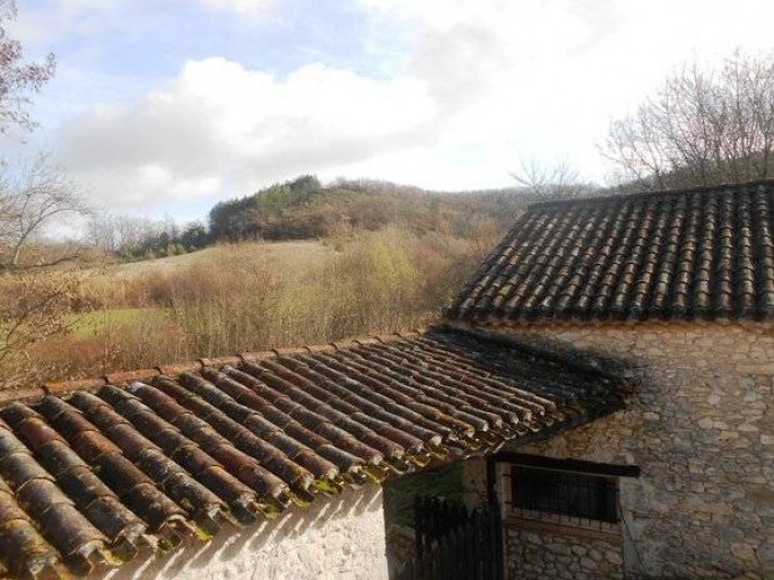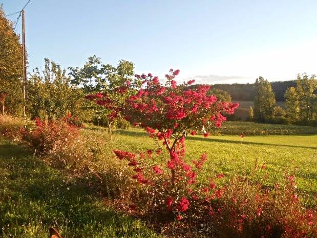 Du sommet de son escalier, vous jouissez d’une terrasse qui domine notre petit bois et notre pièce d’eau.